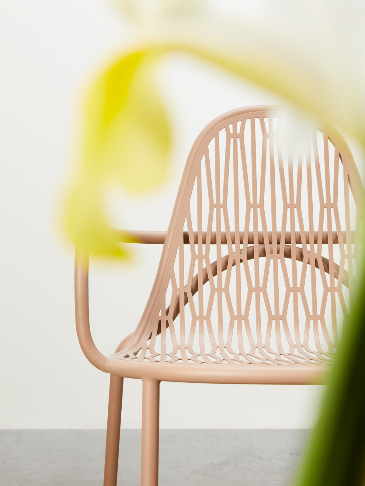 Trotz seiner scheinbaren Einfachheit stellt das Design von Malvasia eine technische Herausforderung dar: Rückenlehne und Sitzfläche werden aus einem einzigen Stück perforiertem und kalandriertem Metall gefertigt und anschließend mit einer solchen Präzision an den Rohrrahmen geschweißt, dass die Verbindungen nahezu unsichtbar sind.