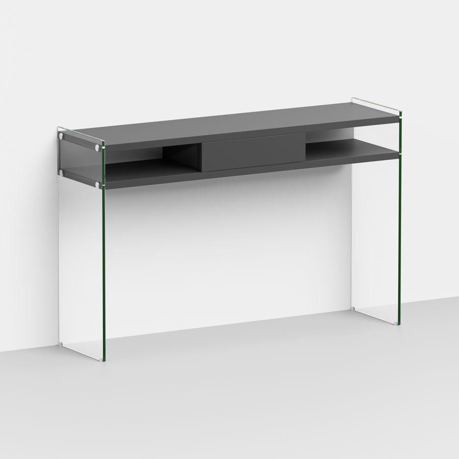 Maya-Konsole mit Schublade, hergestellt aus 25 mm dickem ökologischem Laminat für die Oberseite und 18 mm für den Korpus, mit Seiten aus 10 mm dickem gehärtetem Glas.