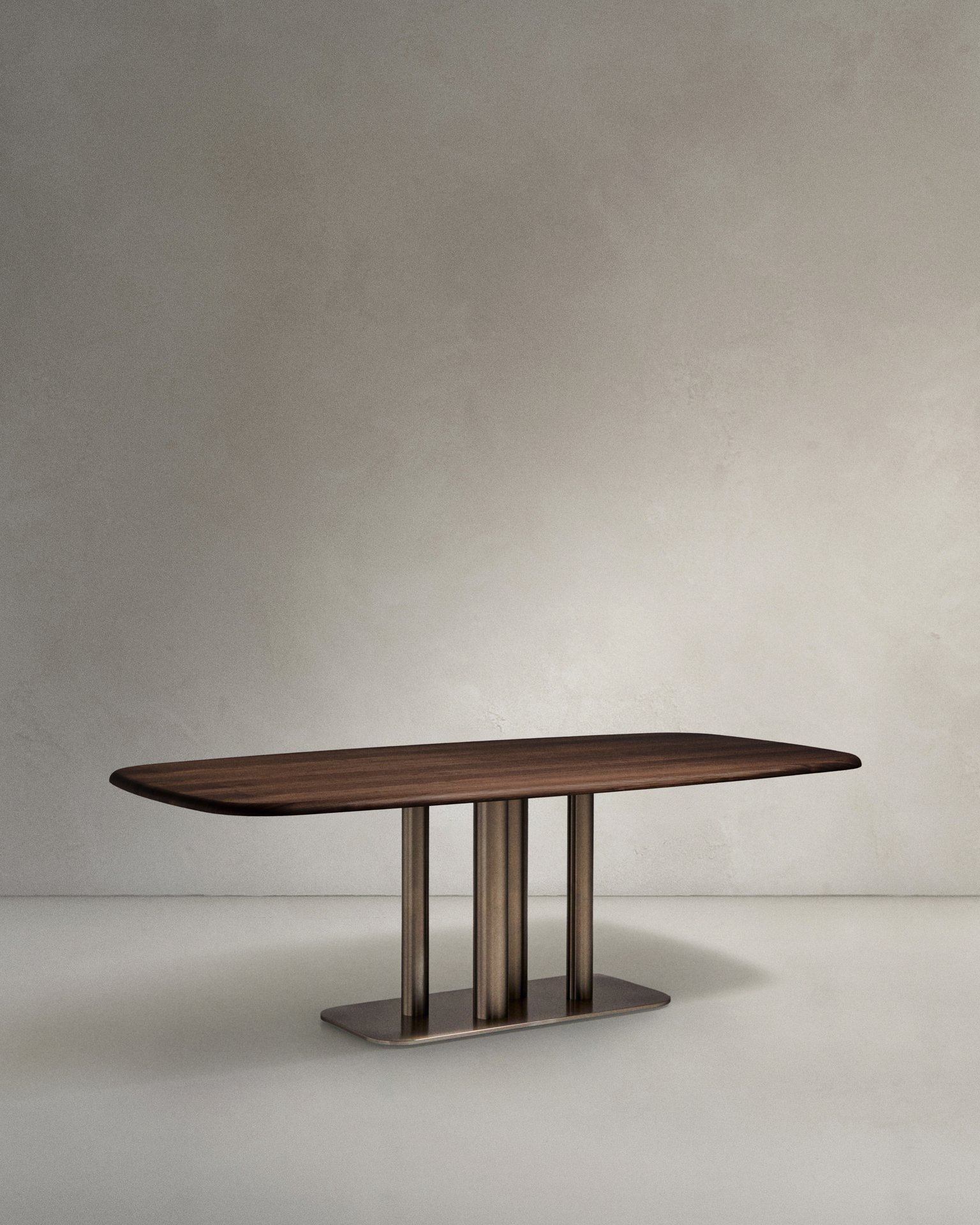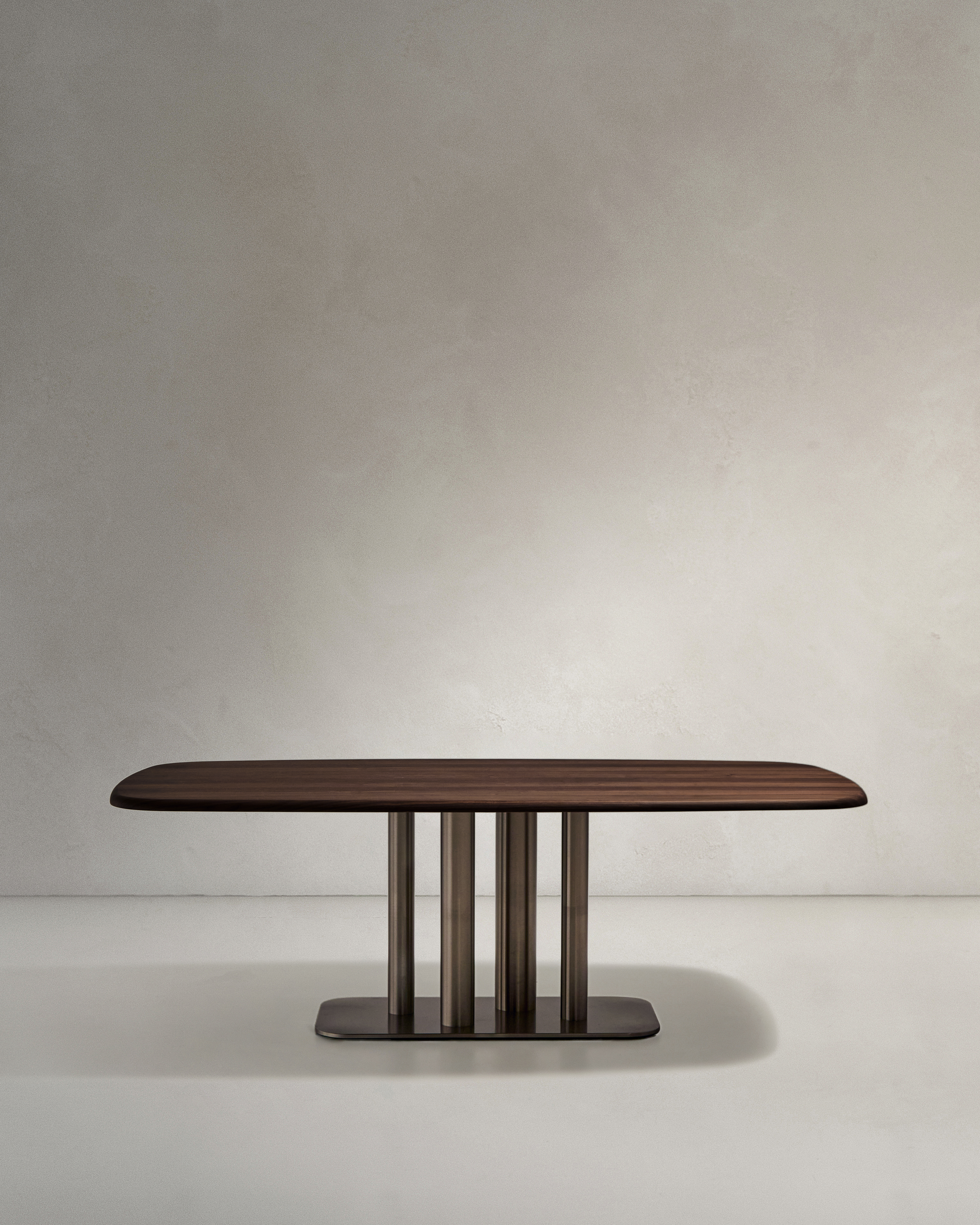 Der Melvar-Tisch ist eine Hommage an die Ästhetik der Mitte des 20. Jahrhunderts, neu interpretiert in einem zeitgenössischen Stil. Edle Materialien und skulpturale Details verleihen ihm eine raffinierte Note. Die Tischplatte aus 0,6 mm starkem Walnussfurnier mit edlem, dunklem Finish strahlt Wärme und Eleganz aus und lädt zu besonderen Momenten ein. Die perfekte Rundung des Holzes, erzielt durch ein Membranpressverfahren, und die Polyurethan-Lackierung garantieren außergewöhnliche Festigkeit und Langlebigkeit und bewahren die Schönheit der Oberfläche über Jahre hinweg. Die ikonische Ausstrahlung des Tisches wird durch die Edelstahlbeine in verschiedenen Durchmessern unterstrichen, deren edle Bürstenoptik Fingerabdrücke minimiert. Dieser Kontrast von Materialien und Formen schafft eine einzigartige, skulpturale Silhouette, die jedes Esszimmer in einen modernen Designraum verwandelt, ohne die zeitlose Eleganz der Kollektion zu beeinträchtigen. Verstellbare Füße sorgen für optimale Stabilität und passen den Tisch an jede Oberfläche an. Dieser Tisch bietet Platz für bis zu 10 Personen und wird zum Mittelpunkt von Zusammenkünften und Feierlichkeiten, wobei Funktionalität und Schönheit bis ins kleinste Detail miteinander verbunden sind.