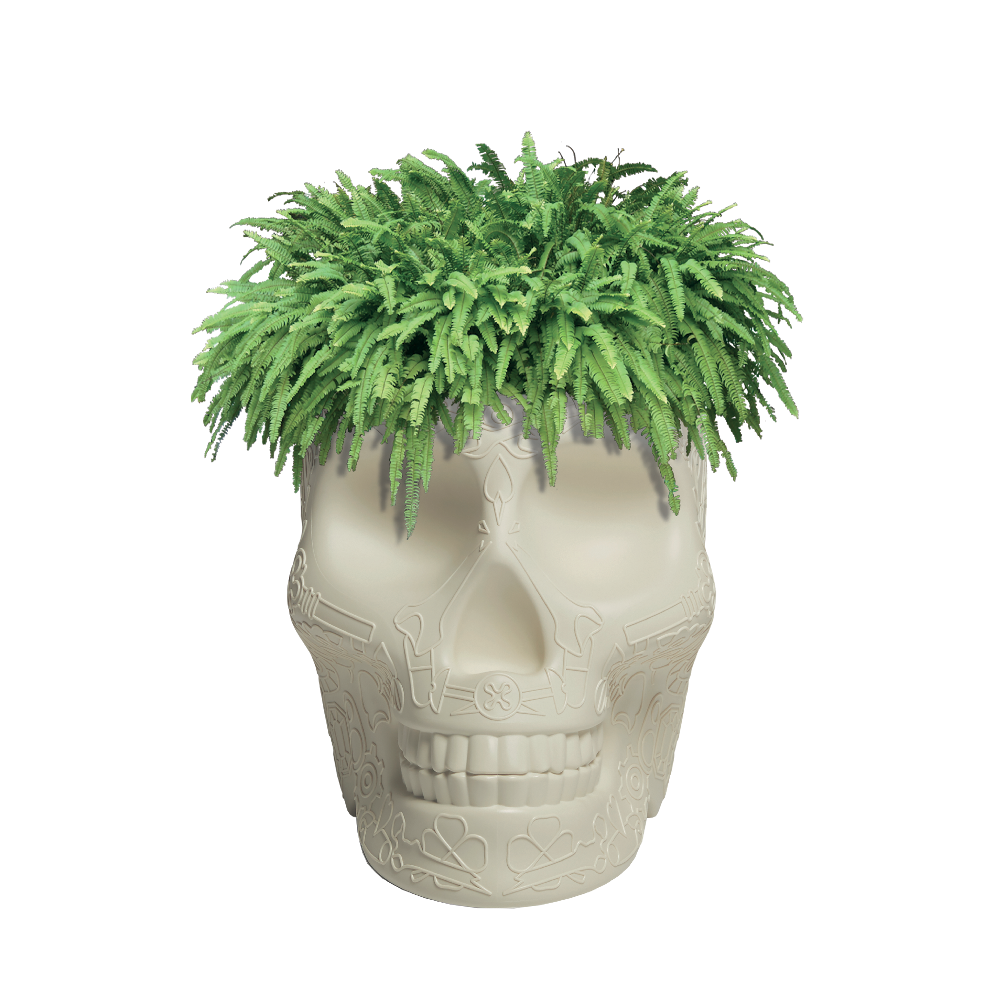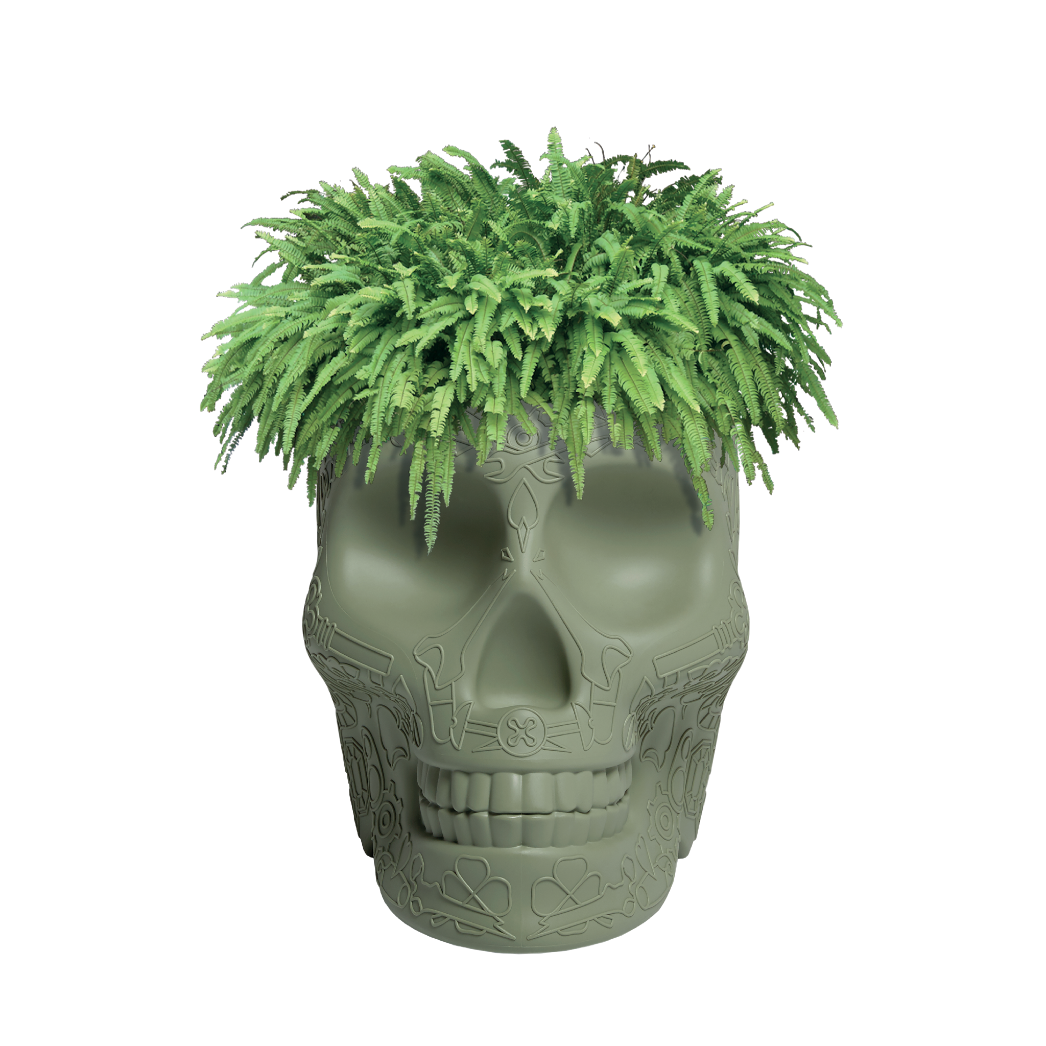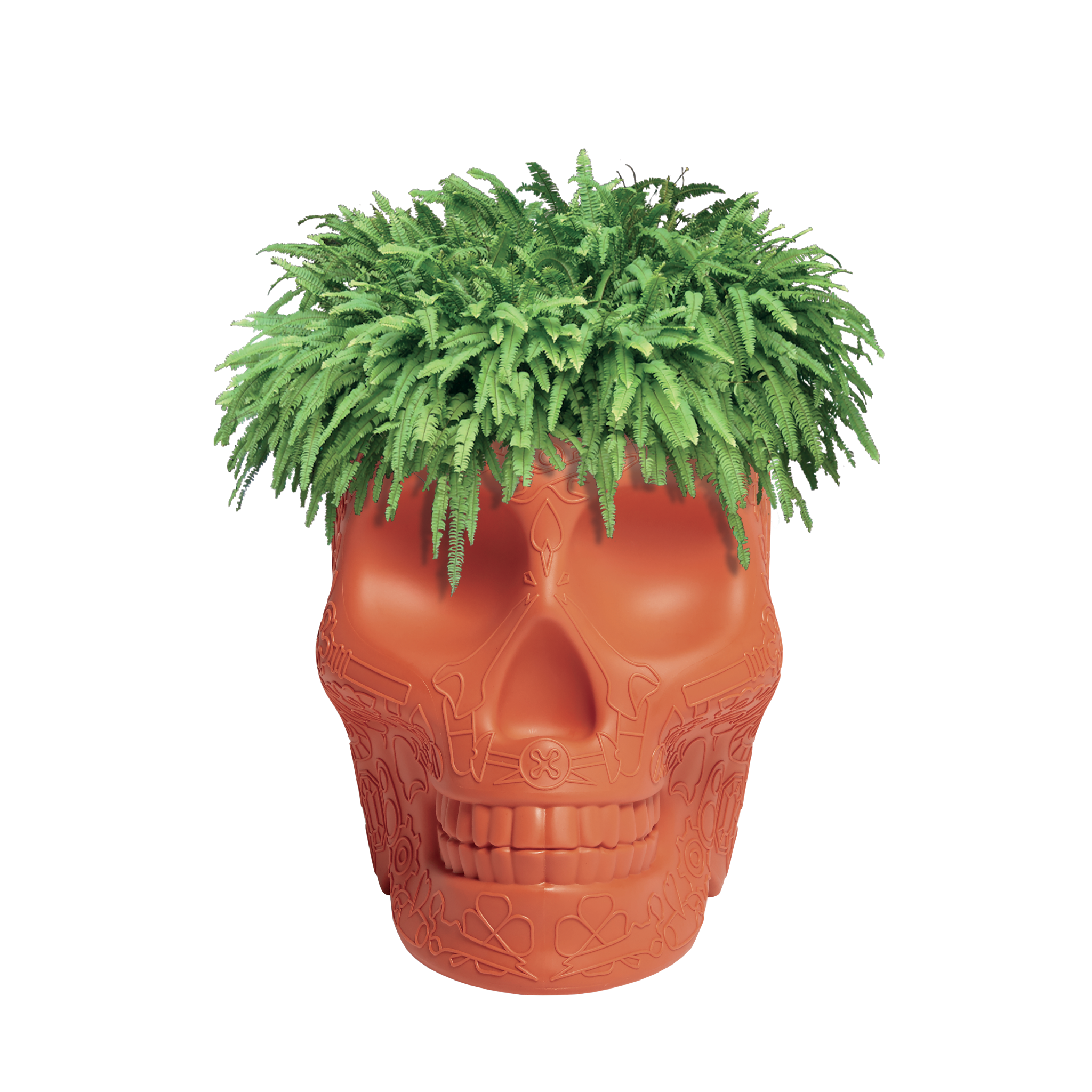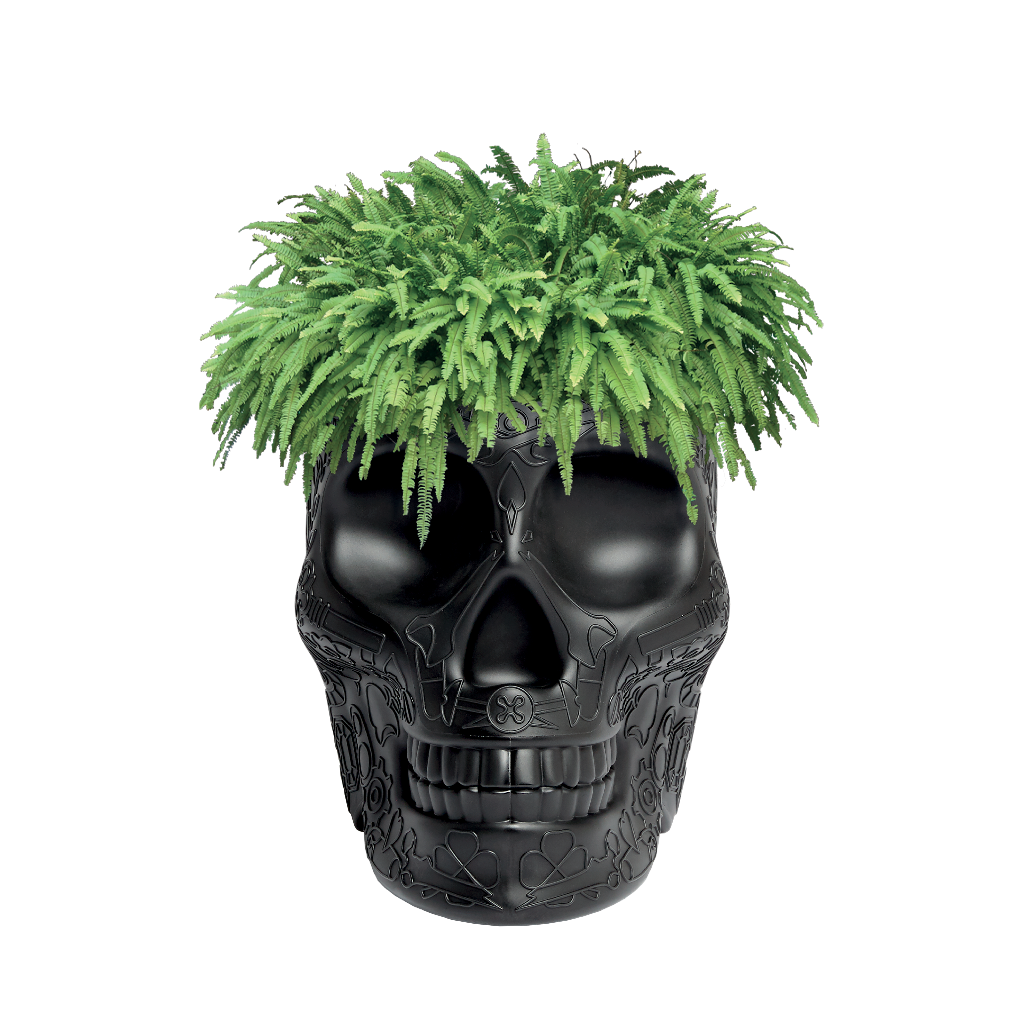 Mexico, entworfen von Studio Job, ist ein schädelartiges Designobjekt mit einem grafischen Motiv auf der Oberfläche, das sowohl als Übertopf als auch als Champagnerkühler fungiert. Mexiko erinnert an die traditionell bemalten Schädel des gleichnamigen Landes und erinnert auf skurrile Weise an die zyklische Natur unserer Präsenz auf der Erde, um den Tod auszutreiben und das Leben zu feiern. Perfekt für Loungebereiche, Esszimmer und Außenbereiche.
