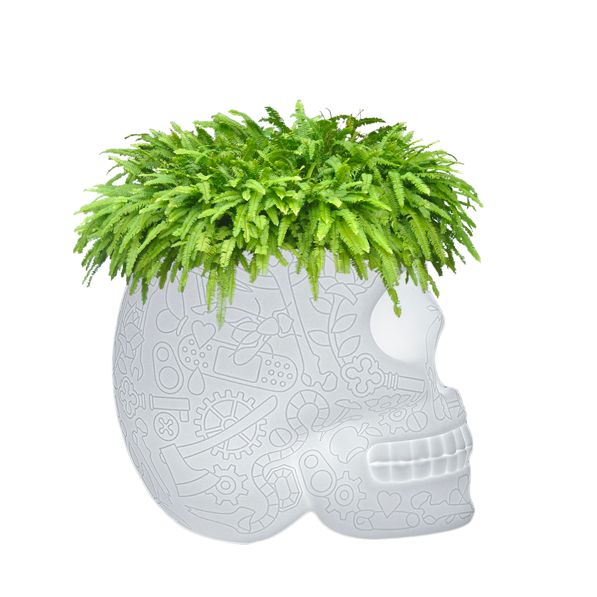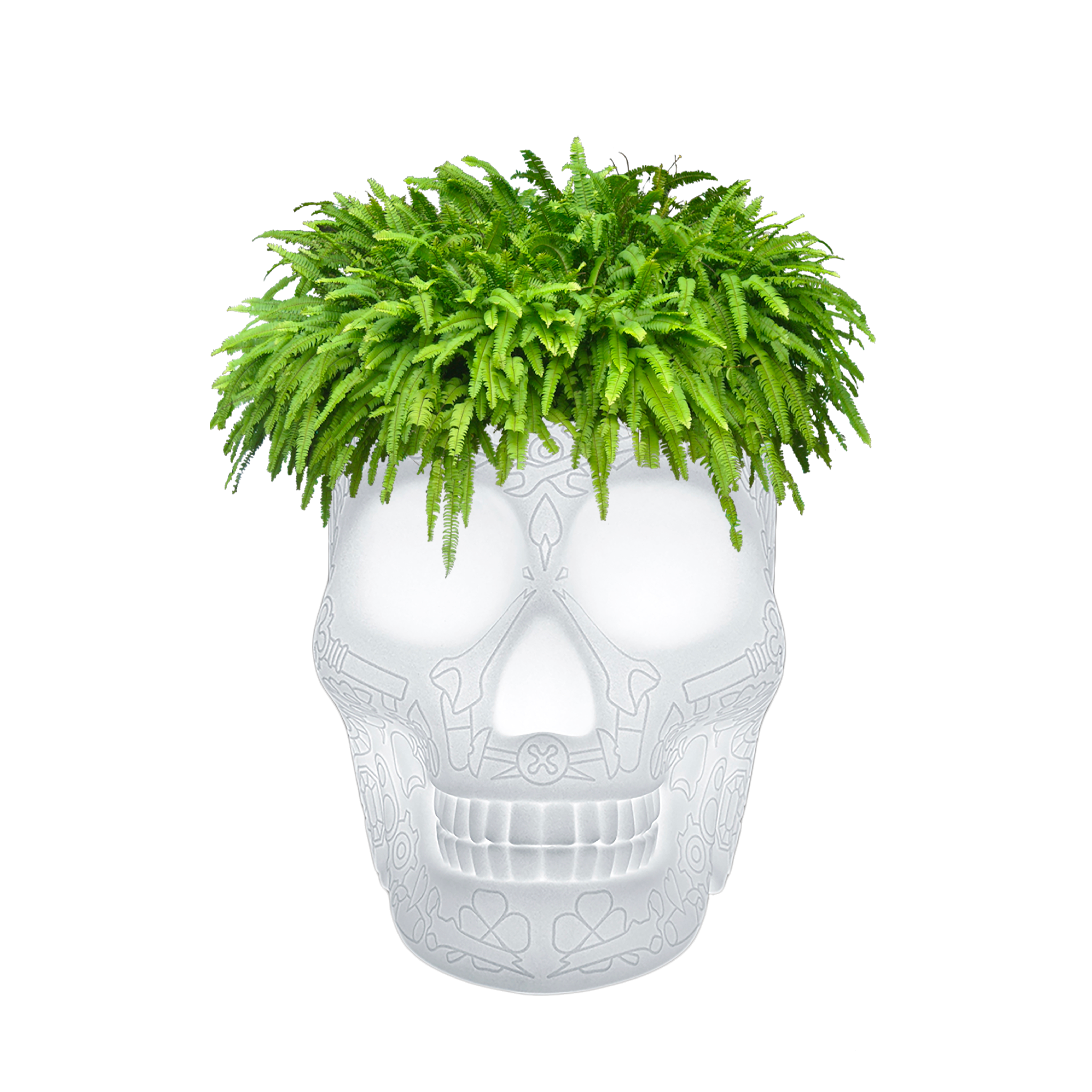 Mexico, entworfen von Studio Job, ist eine schädelförmige Lampe mit einem grafischen Motiv auf der Oberfläche, die sowohl als Pflanzenhalter als auch als Champagnerkühler fungiert. Mexiko erinnert an die traditionell bemalten Schädel des gleichnamigen Landes und erinnert auf skurrile Weise an die zyklische Natur unserer Präsenz auf der Erde, um den Tod auszutreiben und das Leben zu feiern. Perfekt für Loungebereiche, Esszimmer und Außenbereiche. Kabellos, mit wiederaufladbarem Akku, LED-Licht und 16 verschiedenen austauschbaren RGB-Farben, kann per Fernbedienung ferngesteuert eingestellt werden.