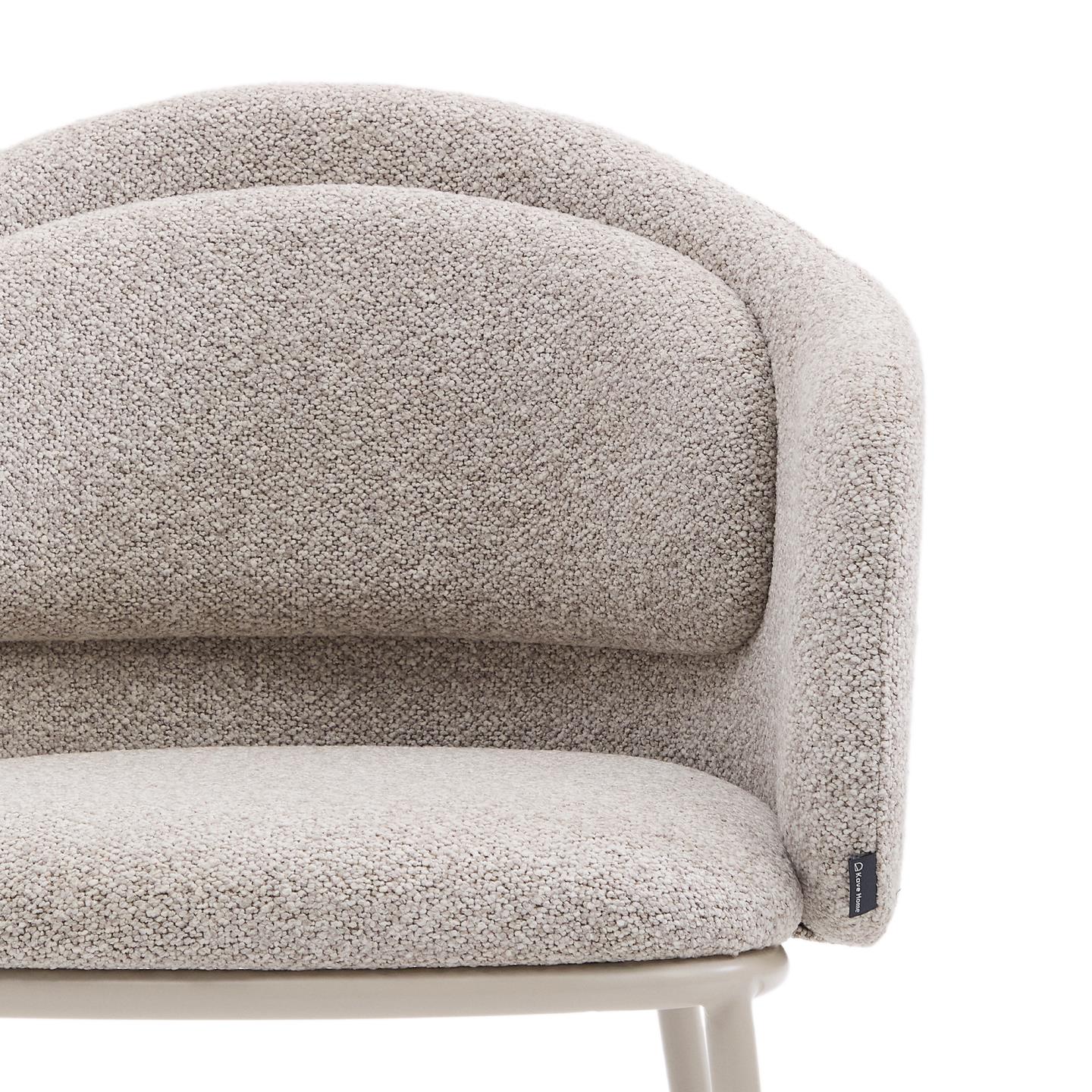 Minda-Stuhl aus dickem, beigem Chenille mit Stahlbeinen in blauem Finish. FSC Mix Credit.
