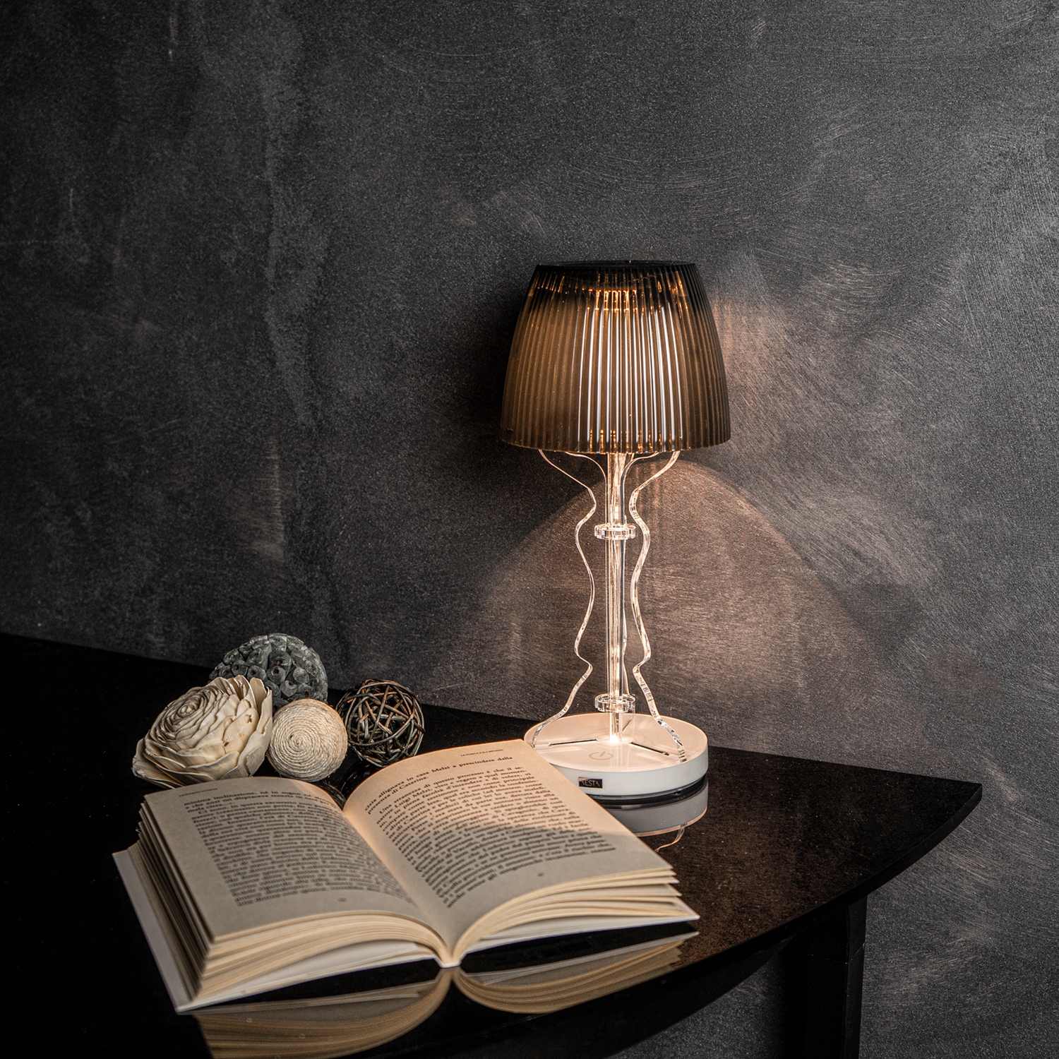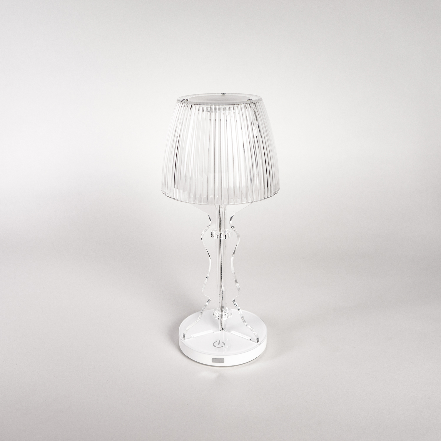 Tischlampe mit Struktur aus transparentem Acrylkristall, prismatischer Kappe und grauem Lampenfassung.