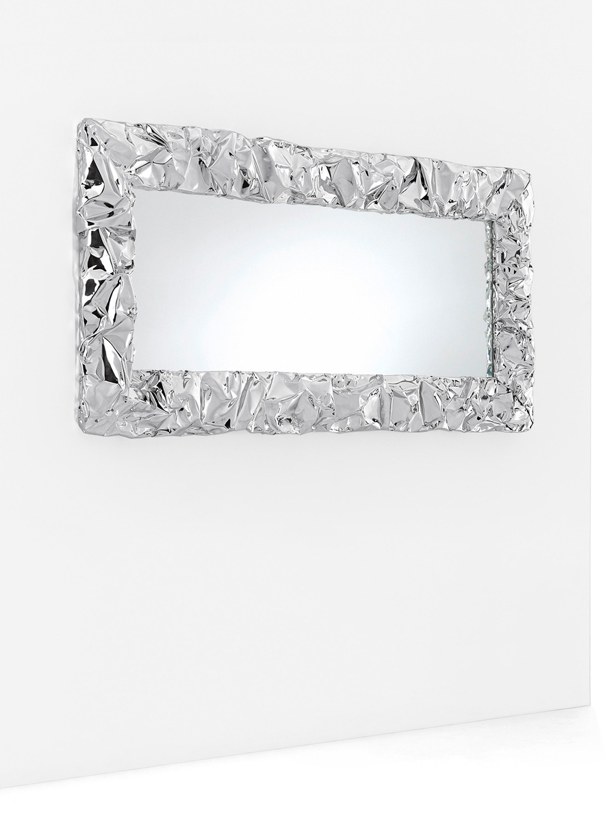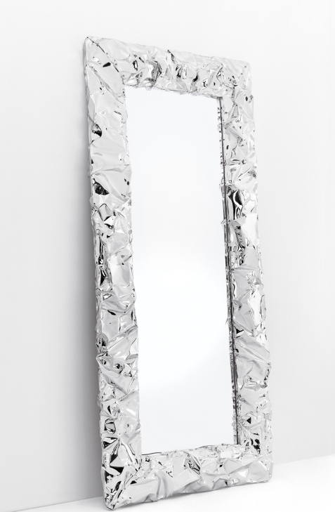 Spiegel mit handgeknittertem Rahmen aus verchromtem Aluminium, beidseitig hängbar. Handwerkskunst, jedes Stück ist ein Unikat.