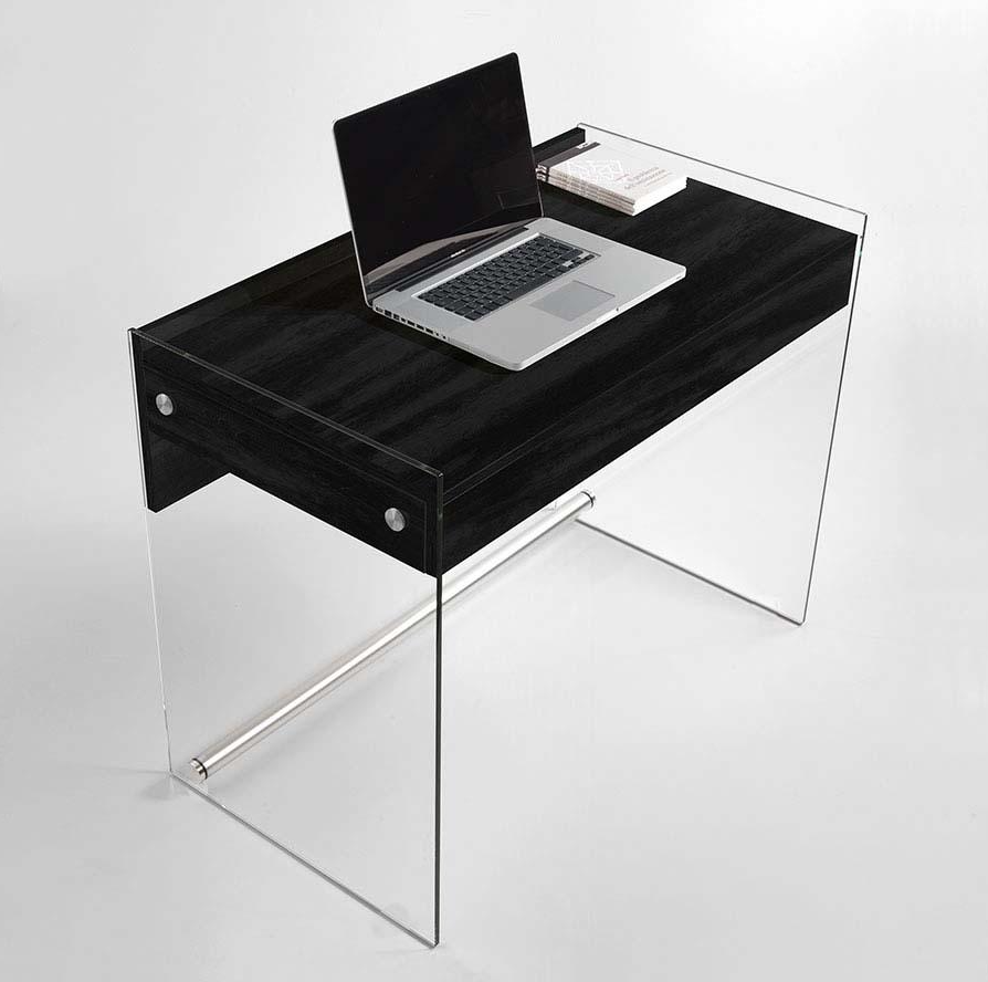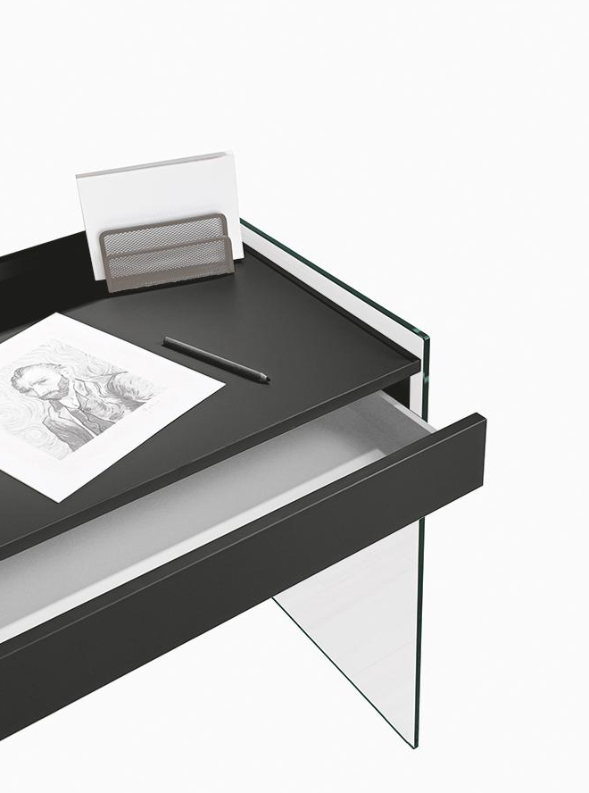 Moderner und funktionaler Schreibtisch mit 10 mm dicker Struktur aus gehärtetem Glas, die der Umgebung Leichtigkeit und Transparenz verleiht.