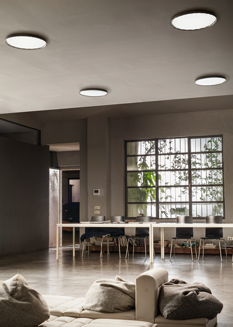Die Pendelversion ist auf einem starren Rohr montiert, während die Deckenversion auch mit verdecktem Zubehör für die Installation auf Gipskartonoberflächen erhältlich ist.