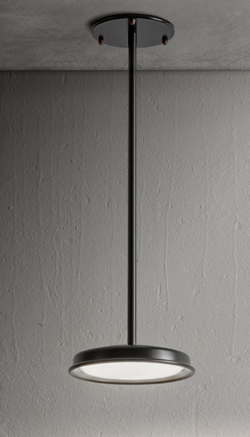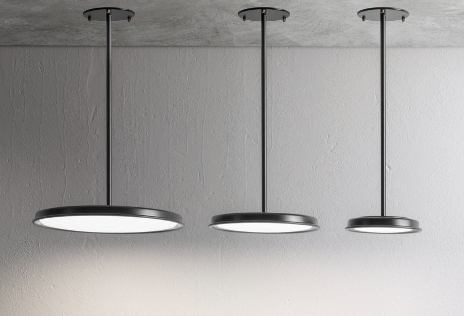 Die Pendelversion ist auf einem starren Rohr montiert, während die Deckenversion auch mit verdecktem Zubehör für die Installation auf Gipskartonoberflächen erhältlich ist.
