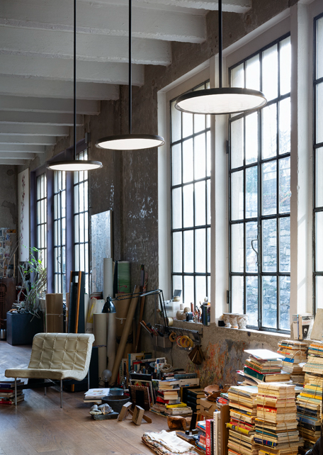 MYMOONS ist eine Serie, die aus drei Geräten unterschiedlicher Größe besteht und sowohl in der Pendelversion mit starrer Halterung als auch in der Deckenversion erhältlich ist.
