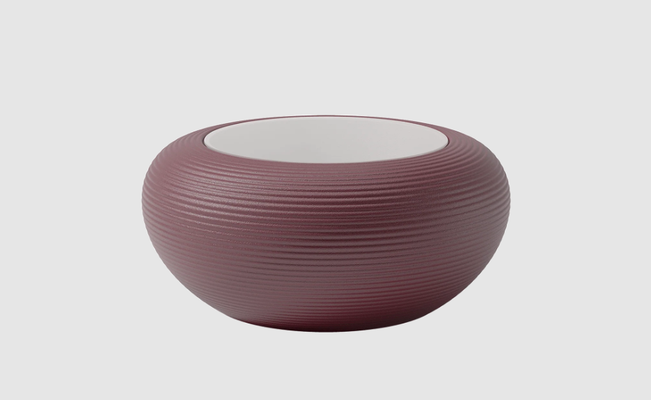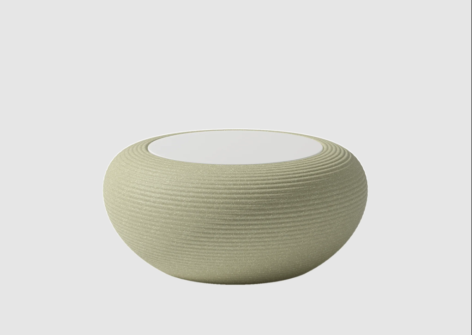 Nami ist ein runder Tisch mit einem Korpus aus recycelbarem Polyethylen und einer lackierten Glasplatte.