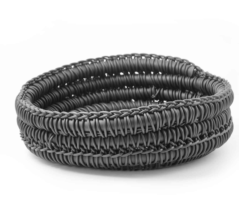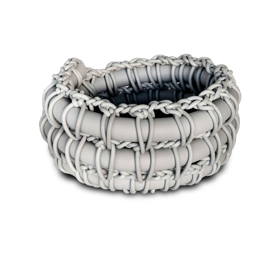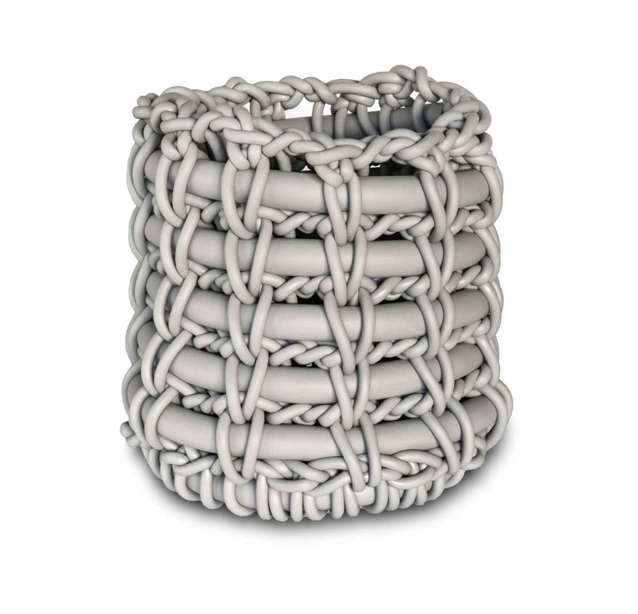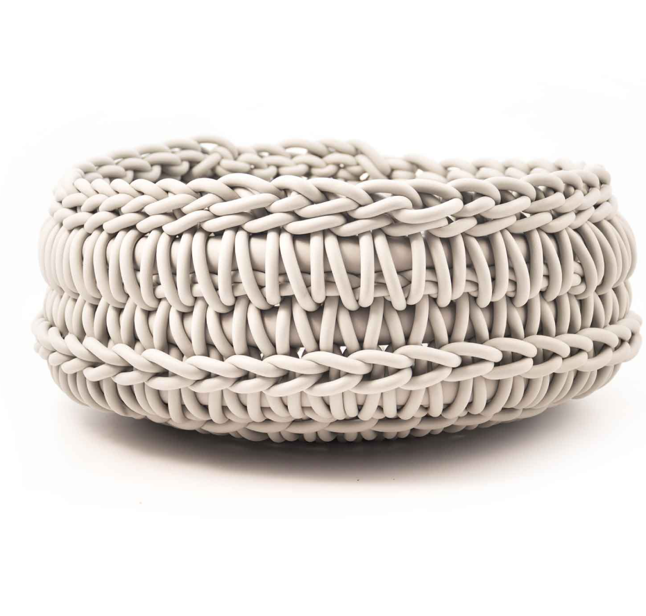 Aus Neoprenfaden gestrickter Nestkorb, eine Kombination aus Weichheit und handwerklicher Präzision.