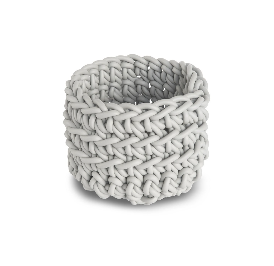 Der Cylinder Basket kombiniert die handwerkliche Tradition des Häkelns mit der Modernität von Neoprenfäden und schafft so einen eleganten und widerstandsfähigen Behälter.