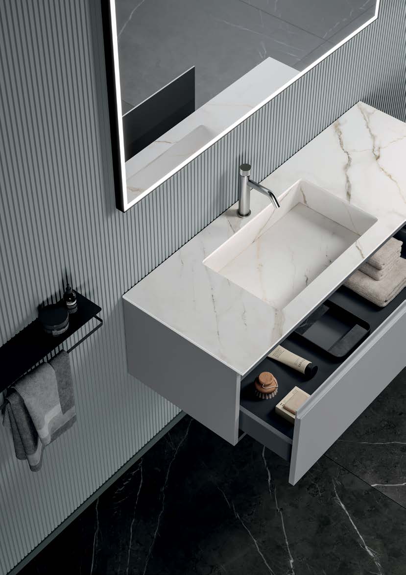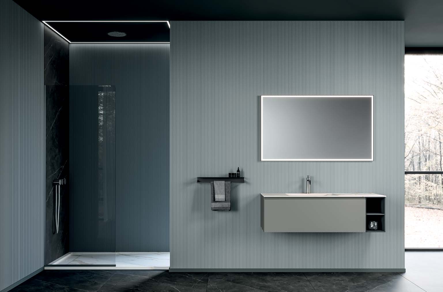 Das integrierte Waschbecken, das in verschiedenen Varianten erhältlich ist, fügt sich perfekt in das Design der Möbel ein, während der Spiegel mit optionaler LED-Beleuchtung die Umgebung mit einer modernen und funktionalen Note vervollständigt.