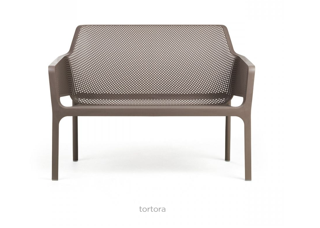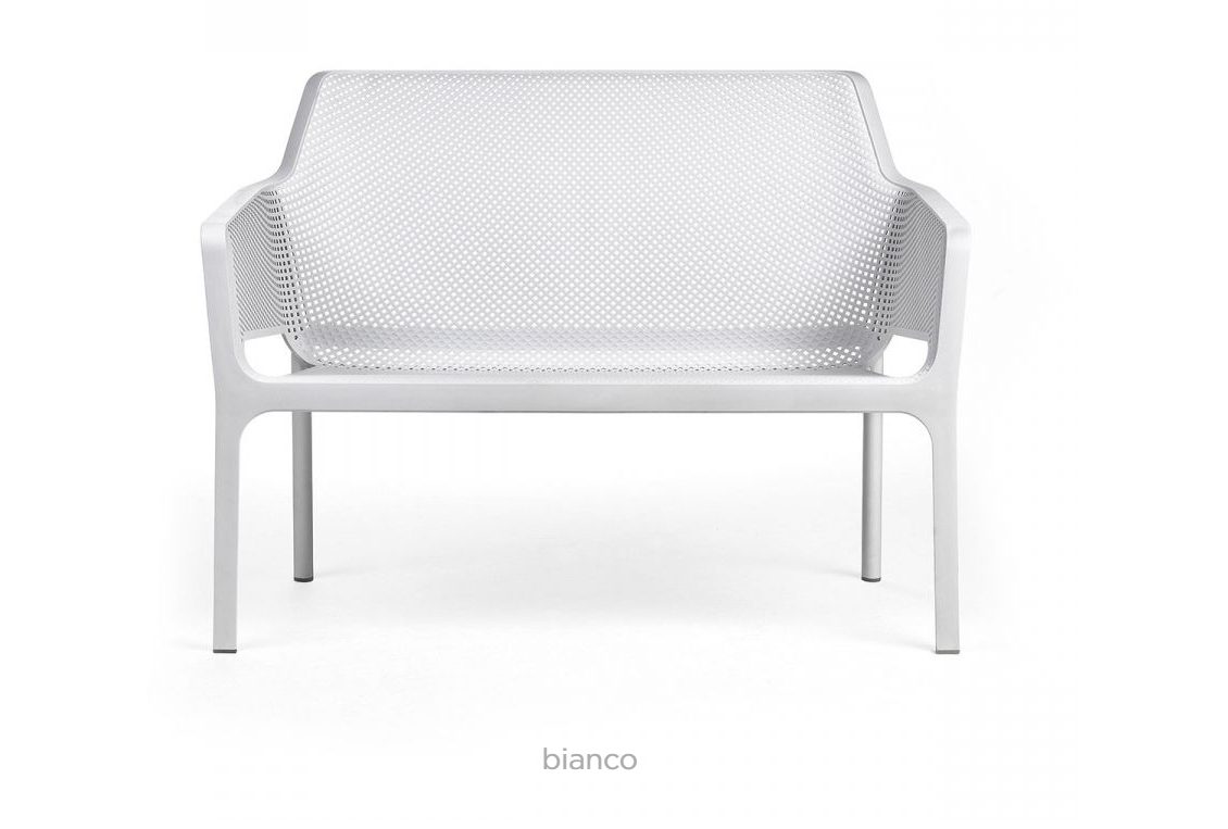 Romantisch und einfühlsam: Net Bench ist eine Zweisitzer-Gartenbank aus glasfaserverstärktem Kunststoff. Charakteristisch für sie sind das quadratische und radiale Lochmuster, klare Linien, dünne, nahtlose Profile und eine große Auswahl an passenden Kissen.
