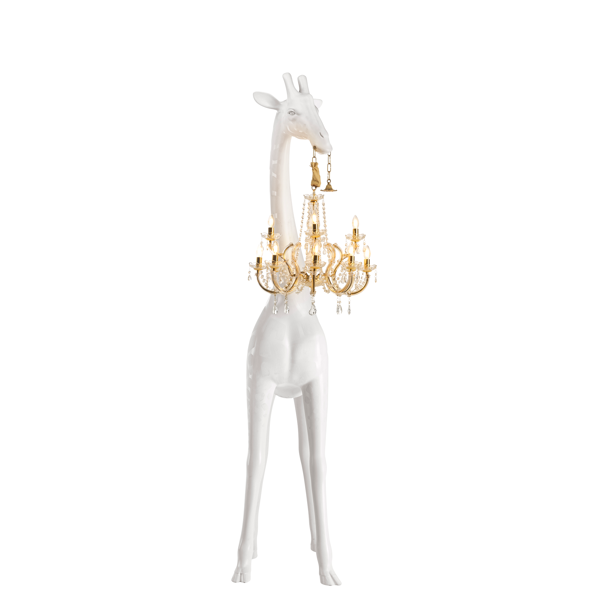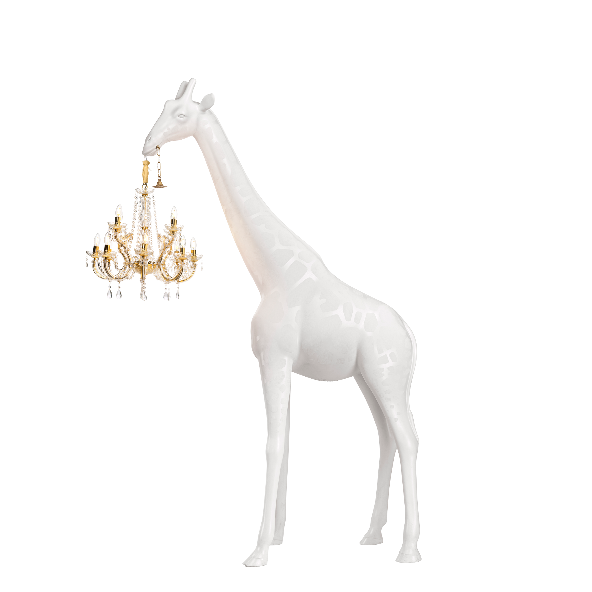 Giraffe in Love M wurde von Marcantonio entworfen und ist eine Giraffe, die einen klassischen Kronleuchter im Marie-Thérèse-Stil mit einer Höhe von 2,65 Metern trägt, einer Größe, die es ermöglicht, in jedes Zuhause einzudringen. Kühn und elegant wird es natürlich der Mittelpunkt in jedem Wohnzimmer sein.