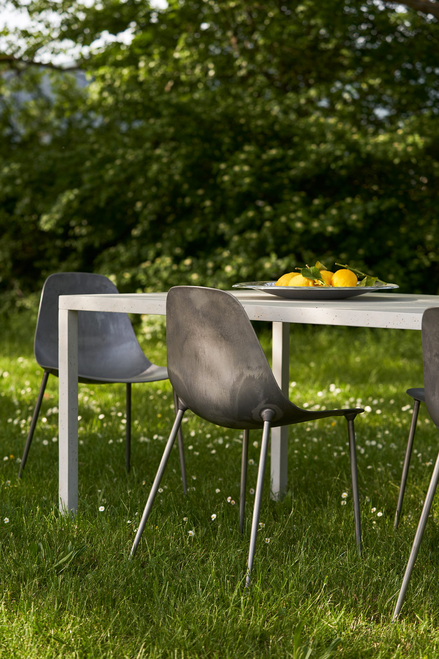Sitz mit Gehäuse aus Aluminiumdruckguss und verzinkter Metallstruktur, innen / außen lackiert, nicht stapelbar.
