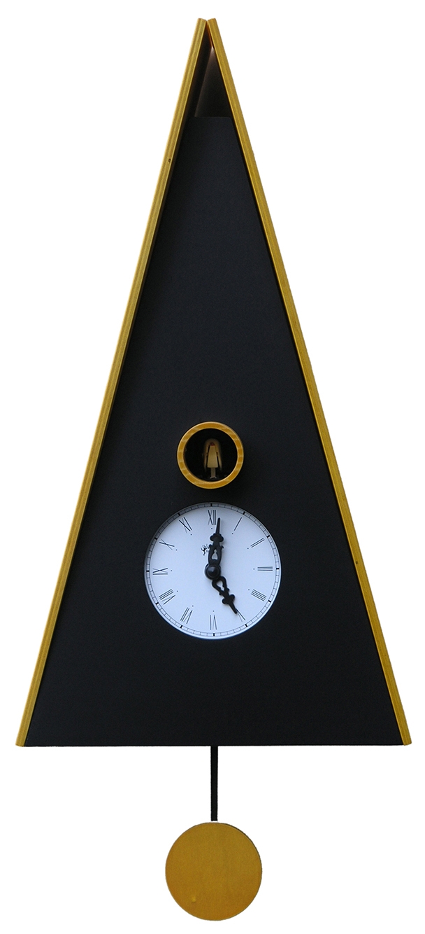 Schwarz lackiertes Birkengehäuse mit gelbem Dach