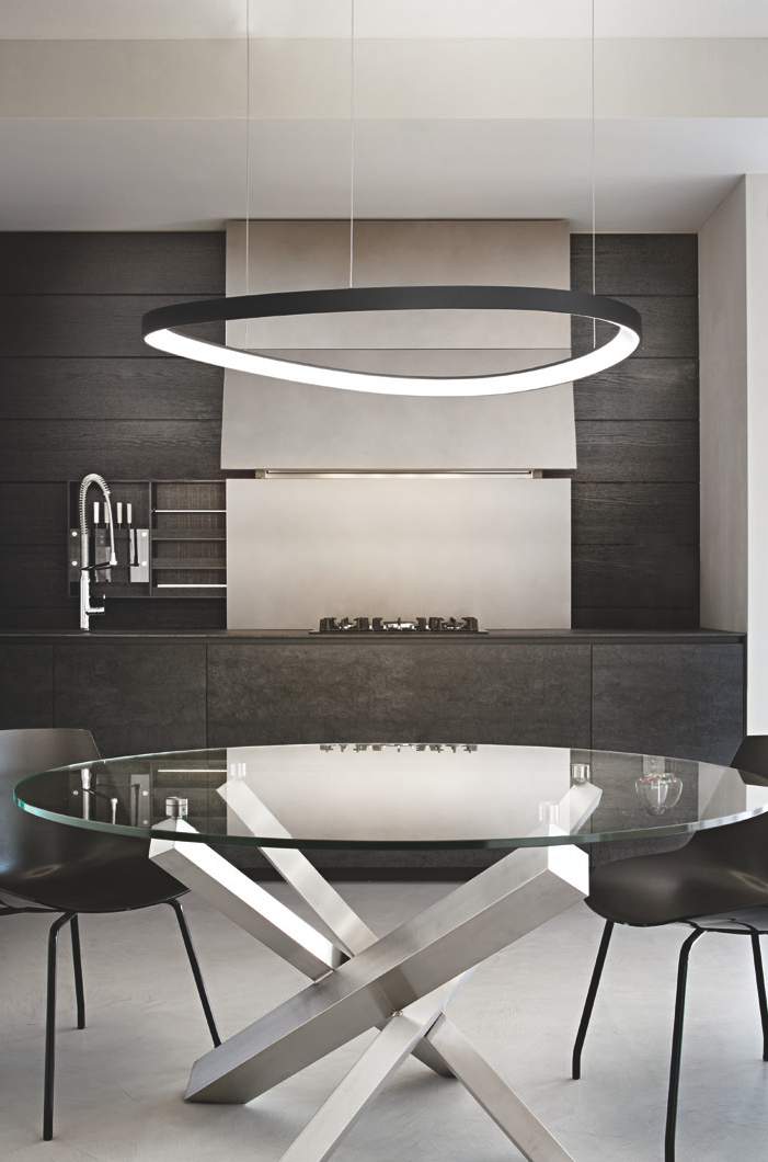 Es handelt sich um eine Pendelleuchte mit zeitgenössischem Design und schlichten Linien, die sich ideal zur Aufwertung moderner und raffinierter Umgebungen eignet.