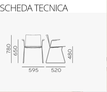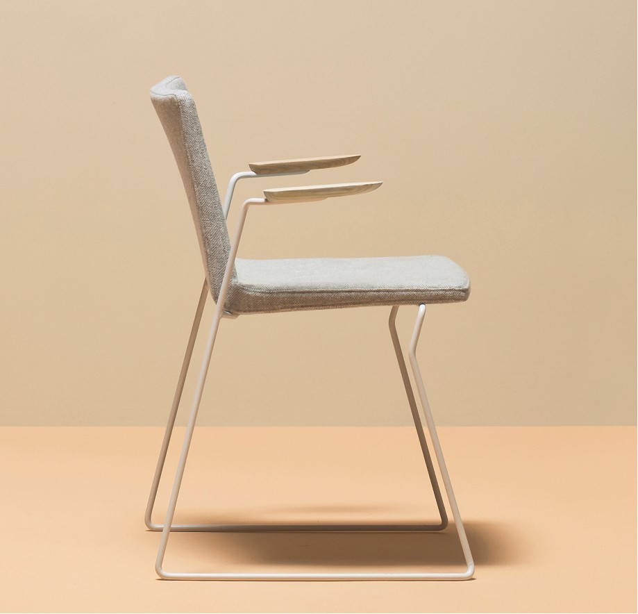 Das Modell 5724 hat einen Schlittenrahmen aus 11 mm Stahlstange und eine Schale aus Eschensperrholz, die mit Leder oder Stoff bezogen ist. Auch in der Version mit Armlehnen erhältlich.