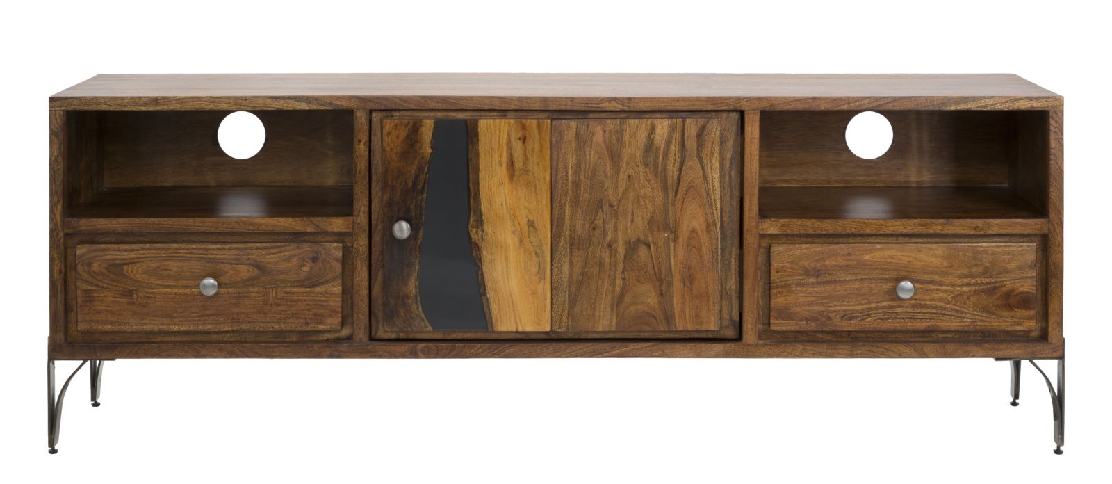 Eleganter TV-Ständer aus massivem Akazienholz, bestehend aus 2 Regalen, 2 Türen und 2 Schubladen. Die besondere Verarbeitung mit Harz auf den Türen verleiht einem äußerst eleganten und klassischen Stück einen Hauch von Farbe und Modernität.