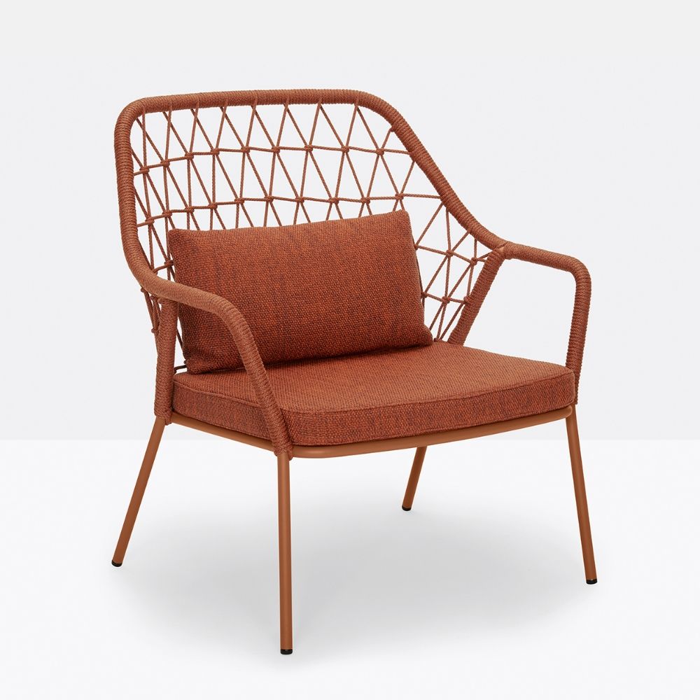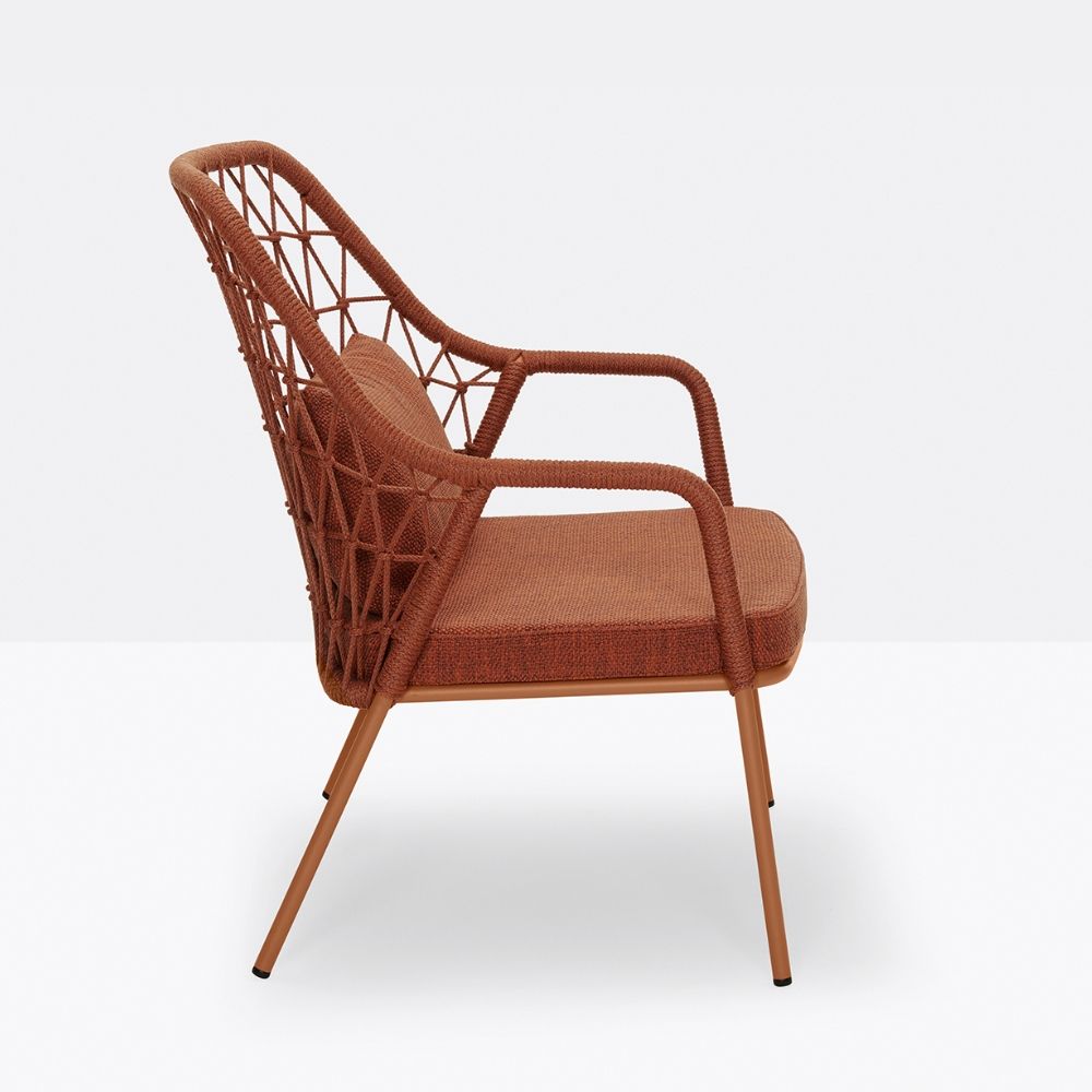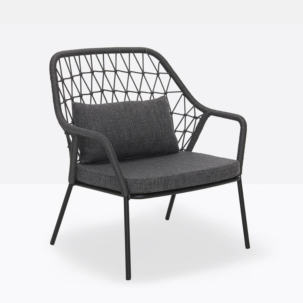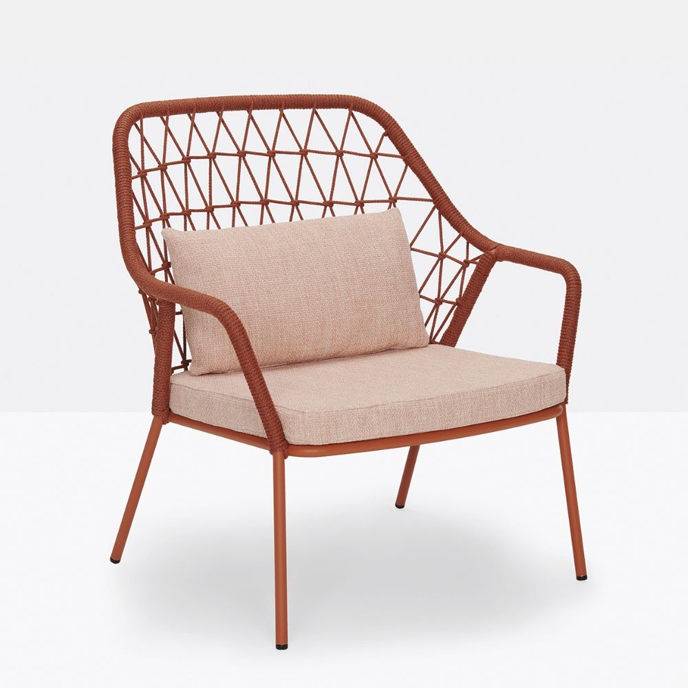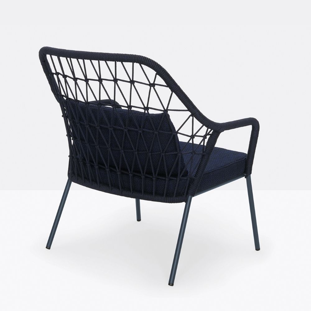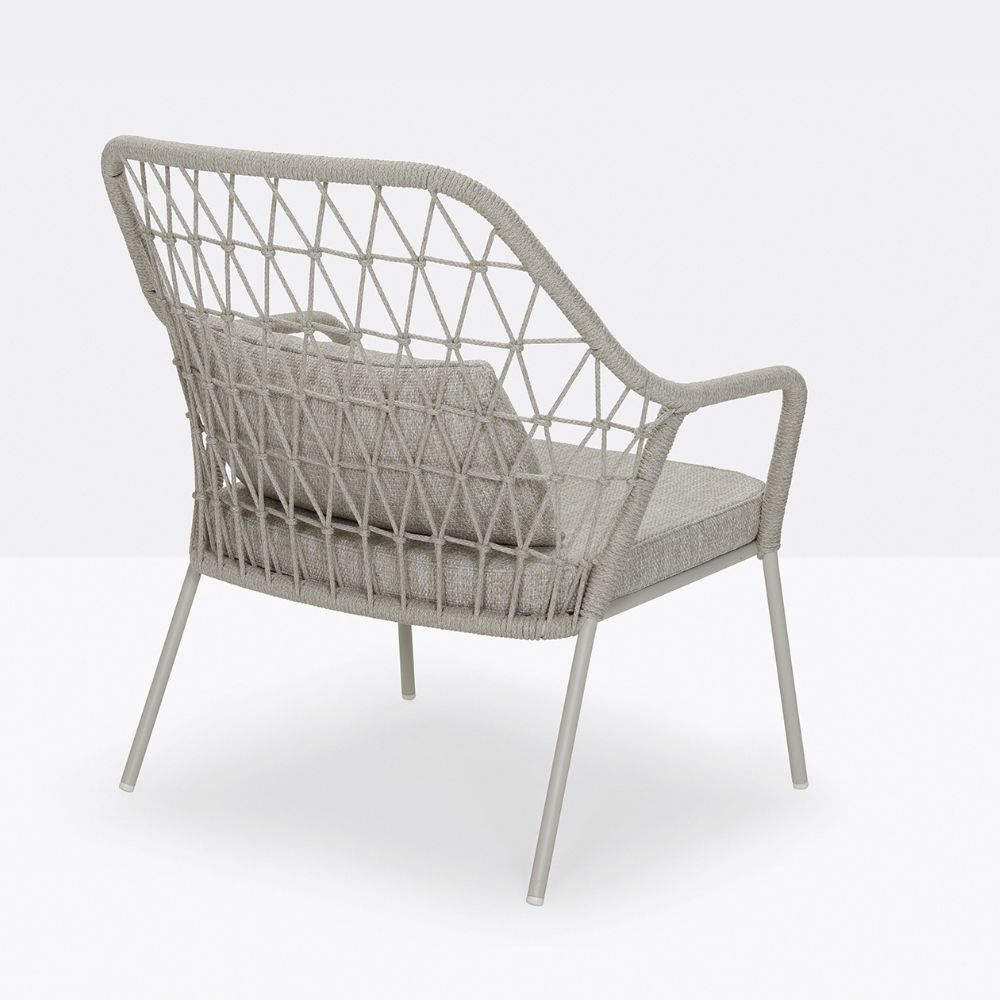 Panarea entstand aus der Idee einer mediterranen Küstenlandschaft, die an die Farben und die erfrischende Brise eines Abendessens im Freien auf einer Terrasse mit Blick auf das Meer erinnert. Ein Lounge-Sessel, der sich durch ein handgefertigtes Geflecht aus 100 % Made in Italy-Polypropylenseil auszeichnet, das sich um das Gestell aus Stahlrohr mit Ø 20 mm wickelt. Auf dem Sitz ruht ein gepolstertes Kissen aus entwässerndem Polyurethanschaum, der mit einem Stoff aus dem gleichen Garn wie das Gewebe überzogen ist.