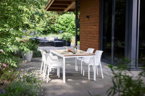 Der Gartentisch Porto 160 von Keter misst 159 x 95 x 75 cm und kombiniert einen lackierten Metallrahmen (erhältlich in Graphit oder Weiß) mit einer Tischplatte in Holzoptik aus strapazierfähigem Polypropylen.