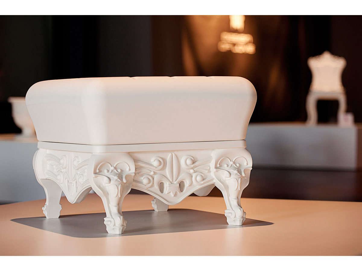 Der kleine Prinz der Liebe ist der perfekte Hocker, der den Sitz der Königin der Liebe ergänzt, der Teil der ursprünglichen Produktlinie der Design of Love Collection ist und sich durch Details und Oberflächen im Rokoko-Stil auszeichnet. Dank des modularen Aufbaus von Sitz und Beinen besteht die Möglichkeit, die Farbkombination zu wählen, wodurch mehr Raum für Kreativität für einzigartige Möbel bleibt.