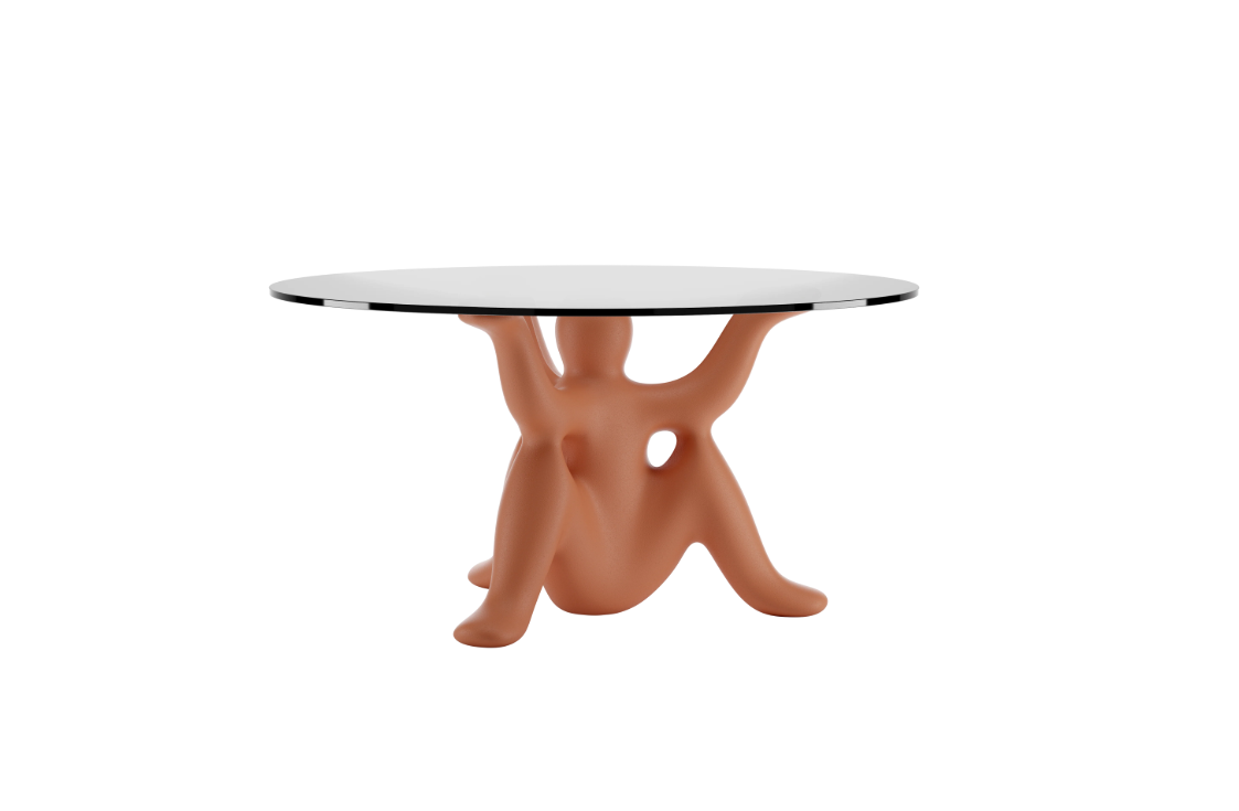 HelpYourSelf ist die von Philippe Starck für Qeeboo entworfene Tischkollektion, bei der fantastische Genies eine große Glasplatte mit Ironie und Stärke stützen.