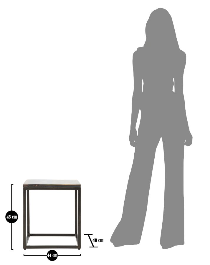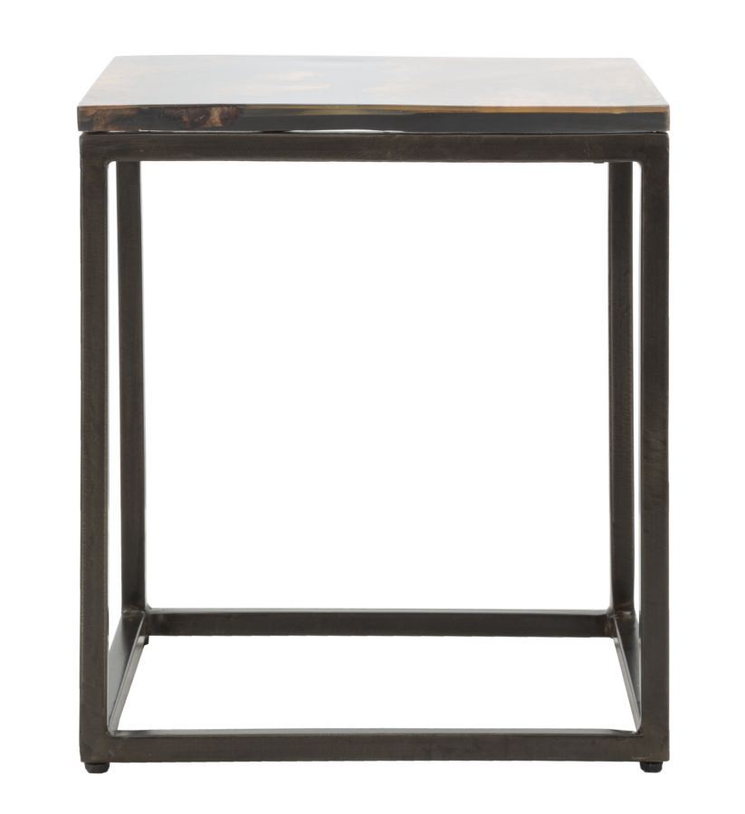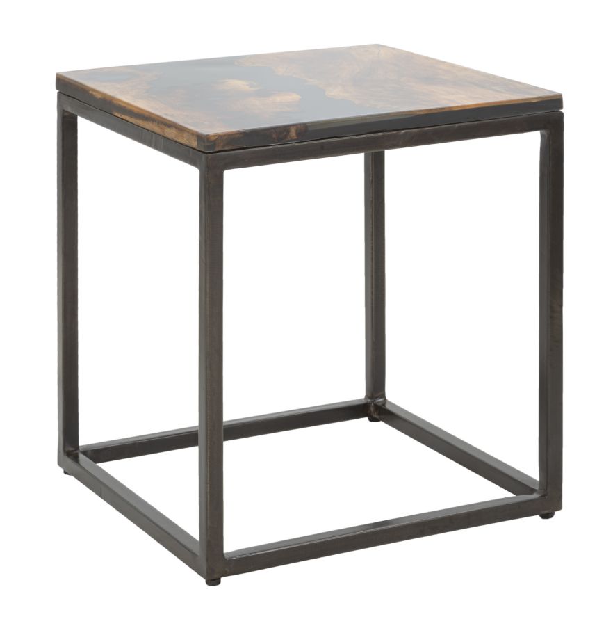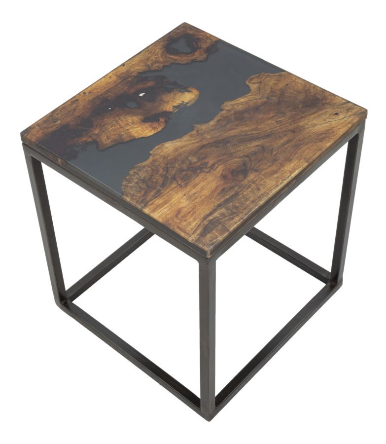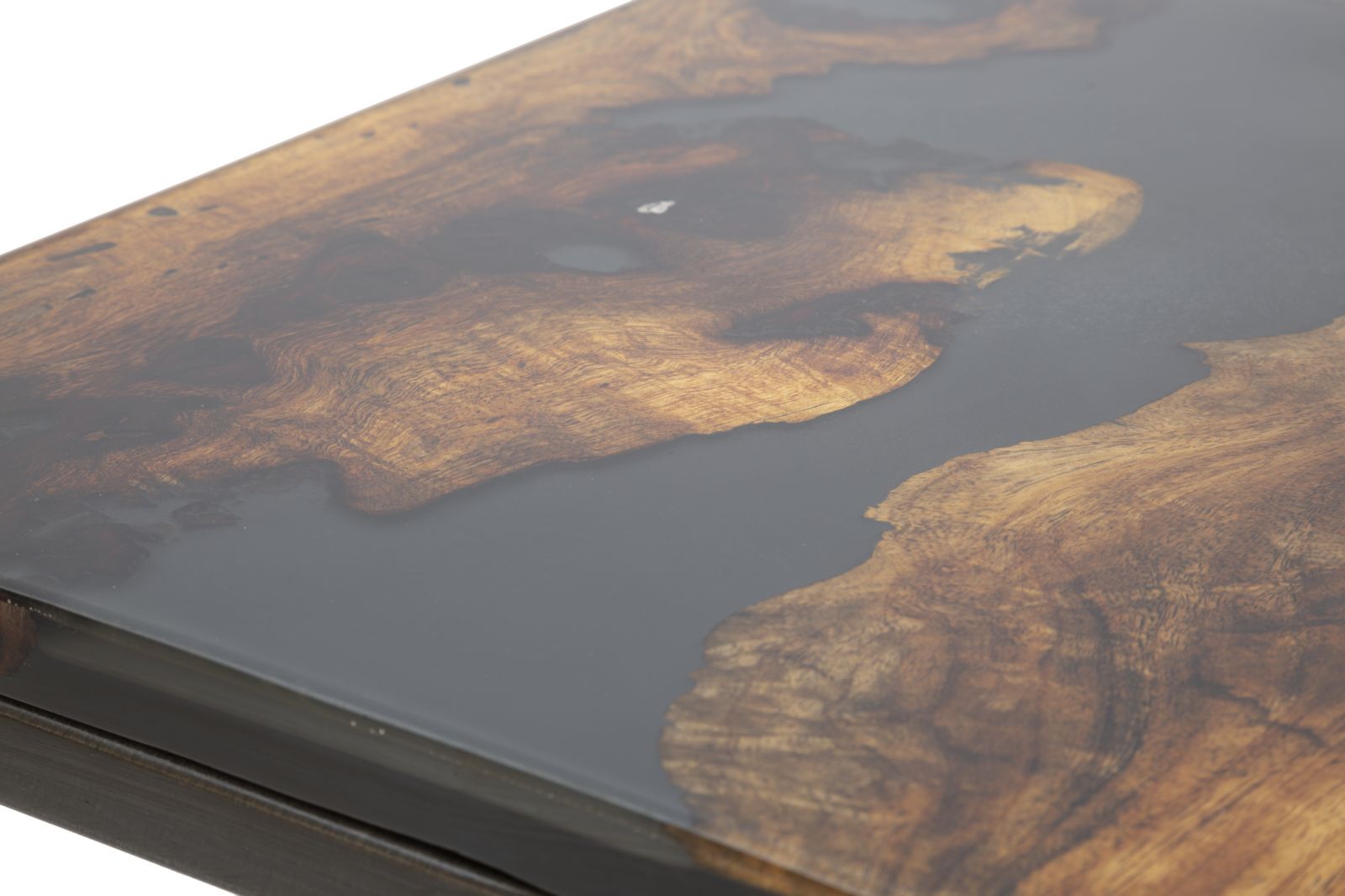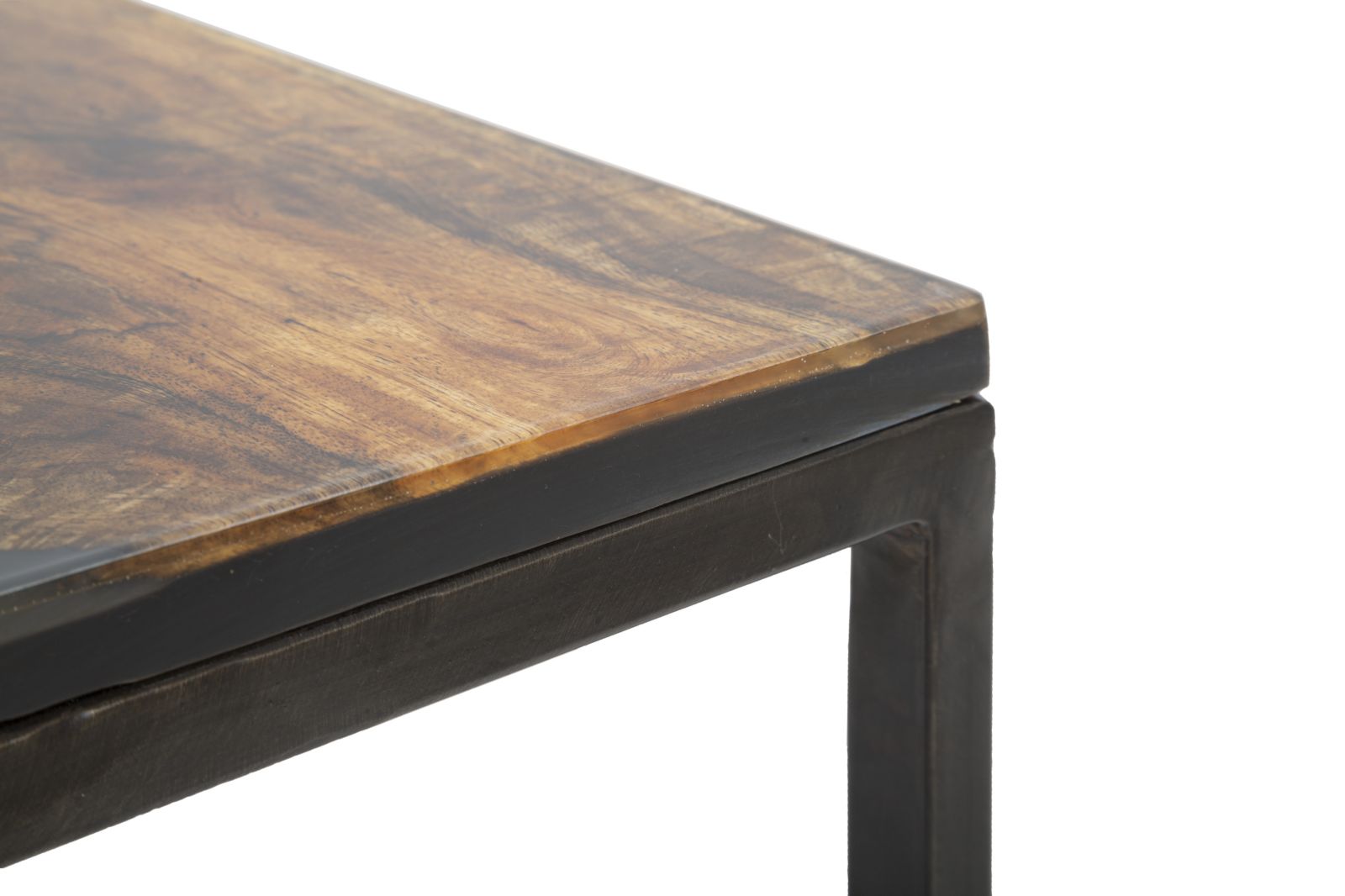 Eleganter quadratischer Couchtisch mit Tischplatte aus massivem Akazienholz und schwarzem Metallgestell. Die besondere Verarbeitung mit Harz auf der Oberseite verleiht einem äußerst eleganten und klassischen Stück einen Hauch von Farbe und Modernität.