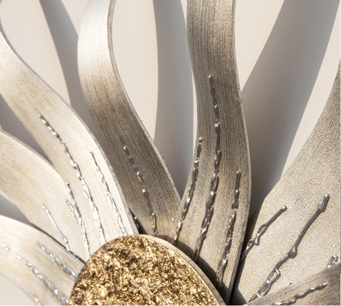 Elfenbeinlackierte Leinwand mit überlappenden geschwungenen Strukturen und zentralem Element aus Blattgold und Silber, von Hand mit strukturiertem Finish verziert.