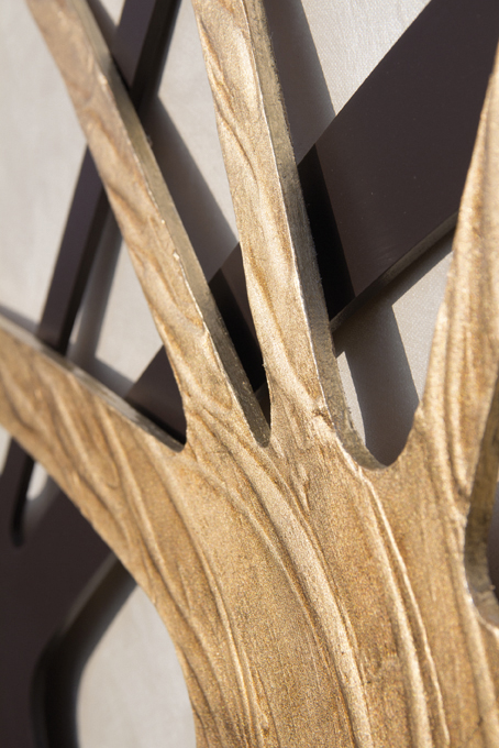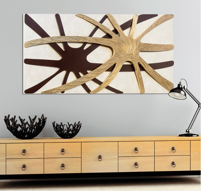 Perlmutt-Leinwand mit zwei überlappenden, geschwungenen Strukturen, kaffee-lackiert, handverziert auf Reliefmaterial und Blattgold.