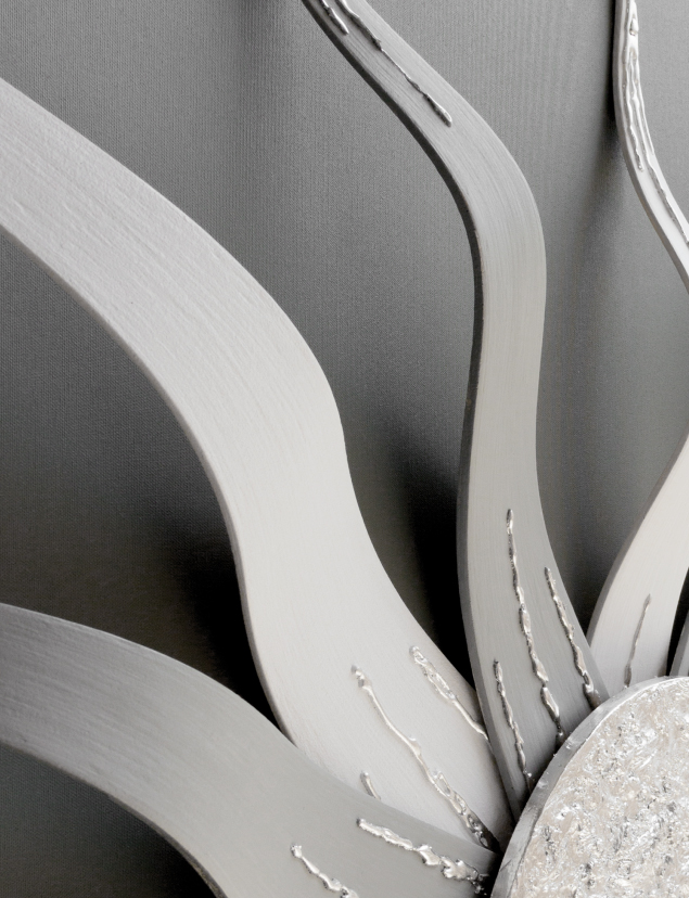 Rahmen auf grau lackierter Leinwand mit gebogenen und überlappenden Strukturen, zentrales Element aus handdekoriertem Blattsilber bei der Materialbearbeitung.