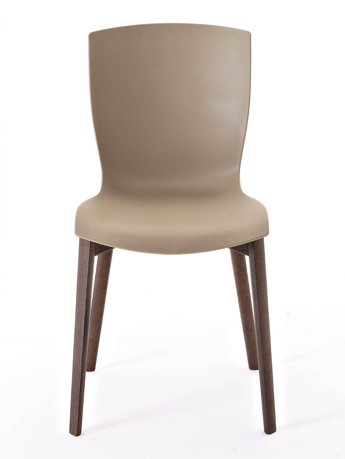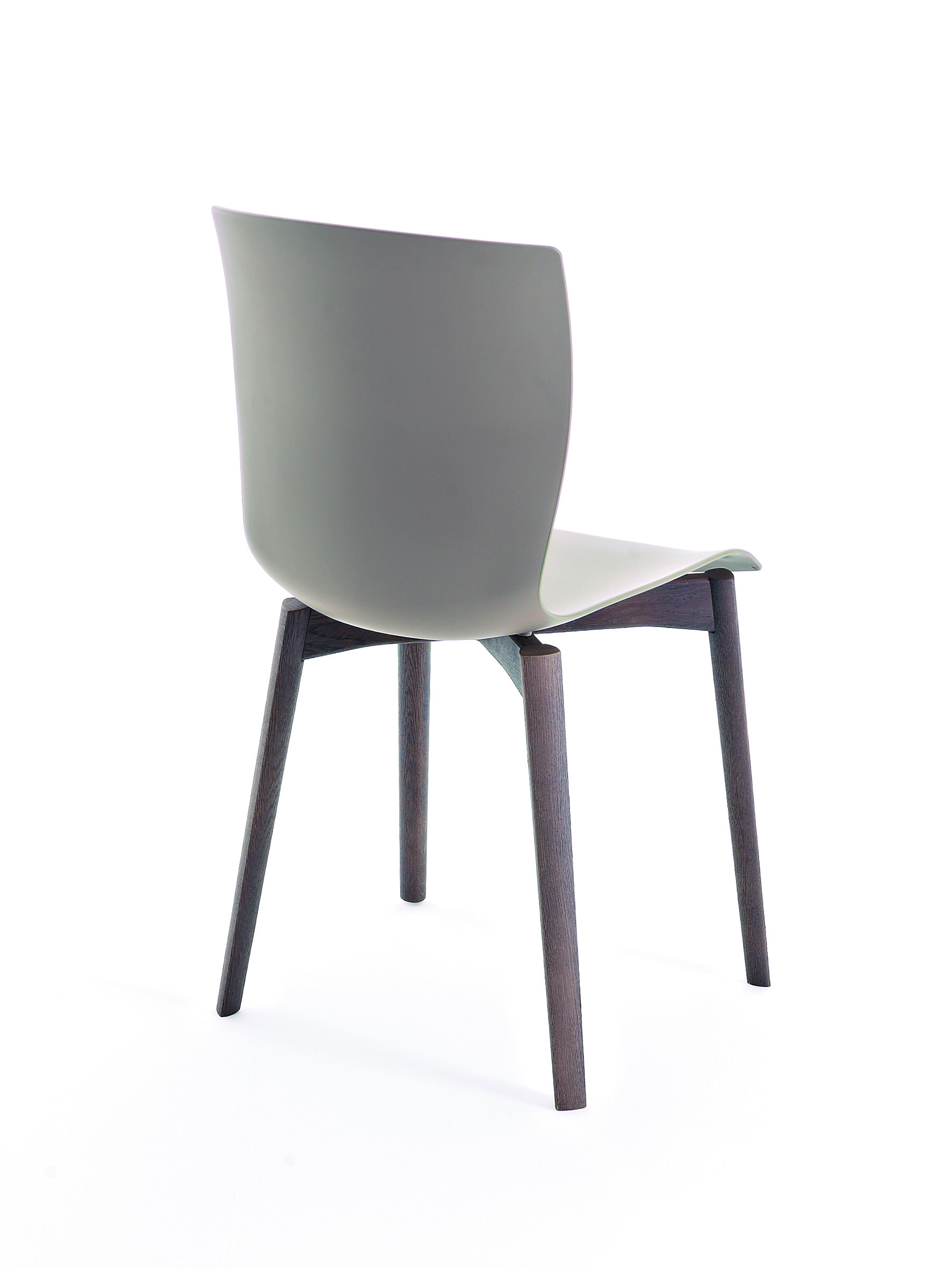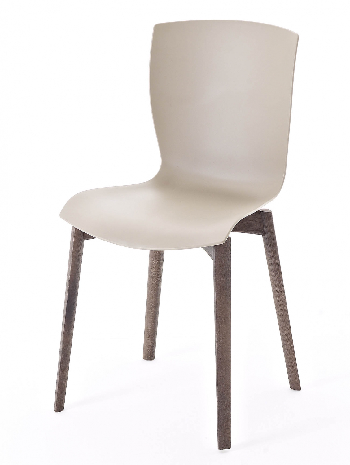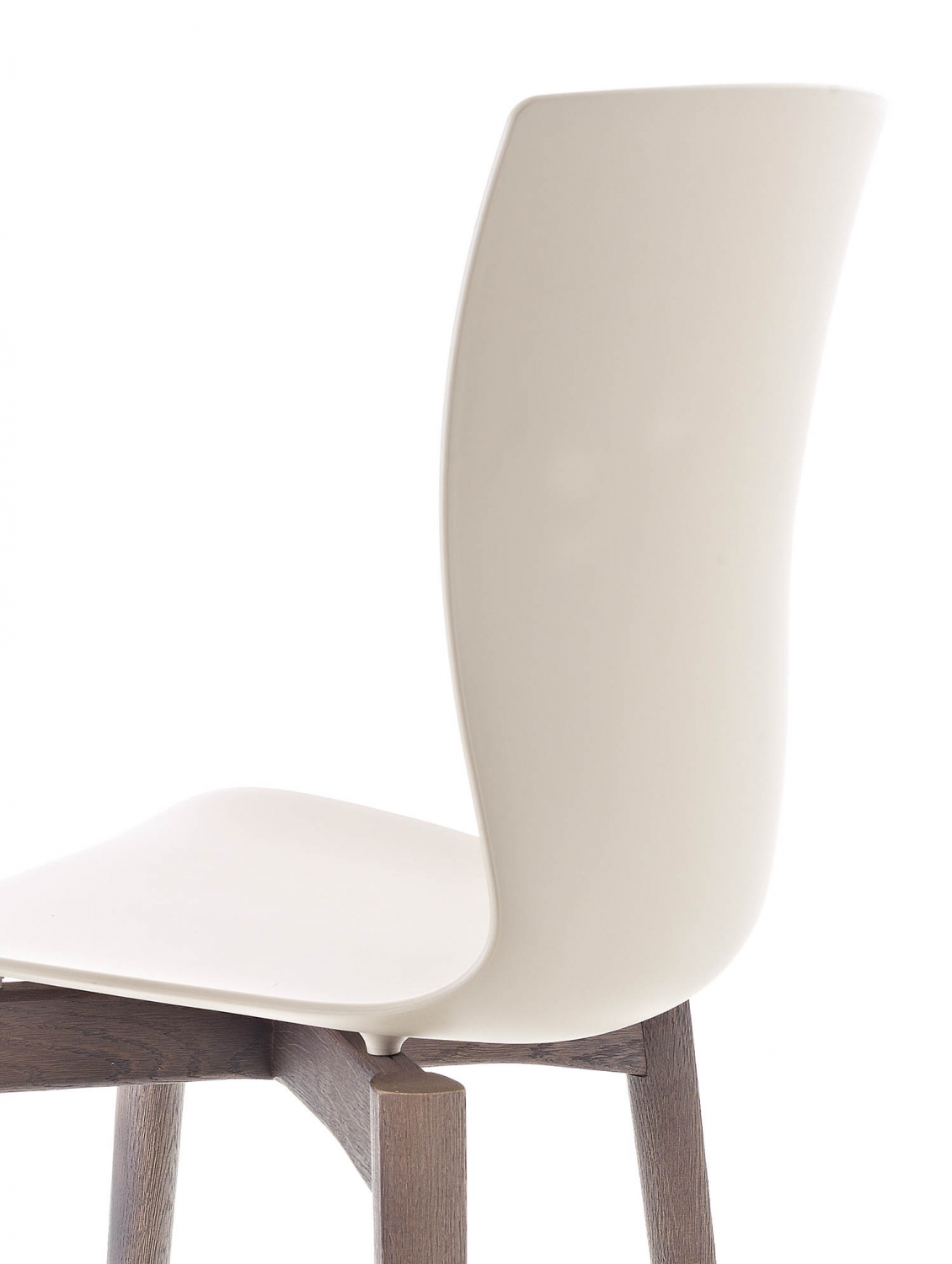 Stuhl mit Eichenholzstruktur und Sitz aus Polypropylen mit weichem Griff.