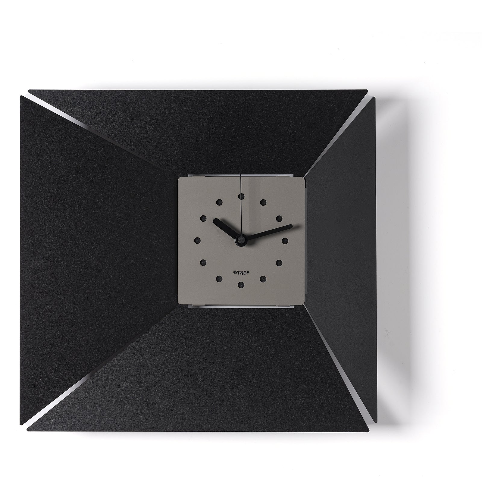 Die Struktur ist quadratisch und misst 42 x 5 x 40 cm in der Höhe. Was sie jedoch einzigartig macht, ist die handwerkliche Verarbeitung der Ecken: Perforiert und nach innen geneigt, lenken sie den Blick auf das kleinere Zifferblatt, das ebenfalls quadratisch und außermittig ist. Dieses Detail erzeugt einen zarten, fast trichterartigen perspektivischen Effekt, der durch die 5 cm Tiefe der gesamten Struktur noch verstärkt wird. Trotz seiner Schlichtheit ist das Zifferblatt dank der perforierten Kreise, die die Zahlen ersetzen und ein klares Ablesen der Zeit ermöglichen, funktional.