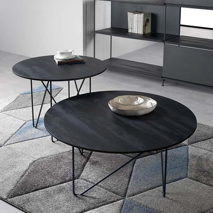 Runder Couchtisch in Form mit Struktur aus sablé-lackiertem Stahl und Ablage aus 12 mm starkem ökologischem Laminat.