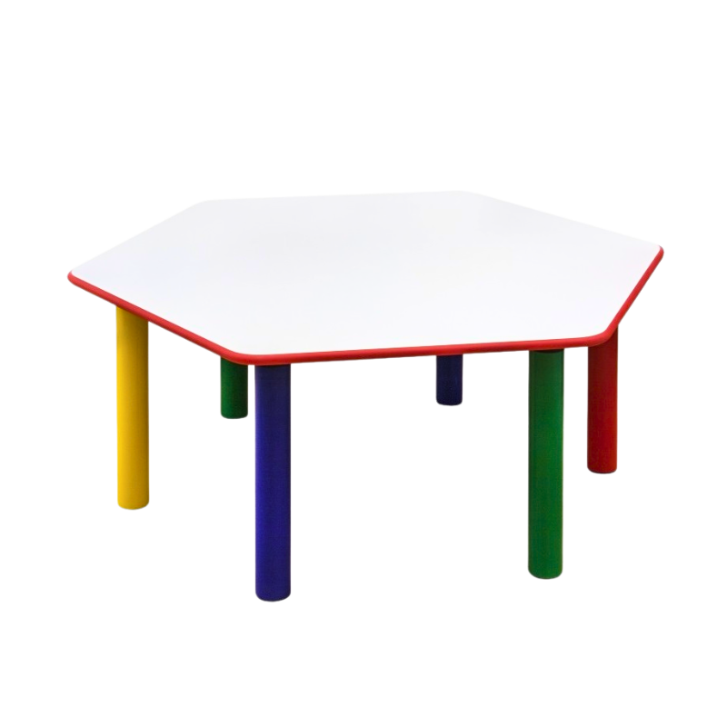 Der sechseckige Tisch für Kinder verfügt über eine besondere Struktur, die Robustheit, Sicherheit und attraktives Design vereint und sich perfekt für die Schule, die Freizeit und das Zuhause eignet.