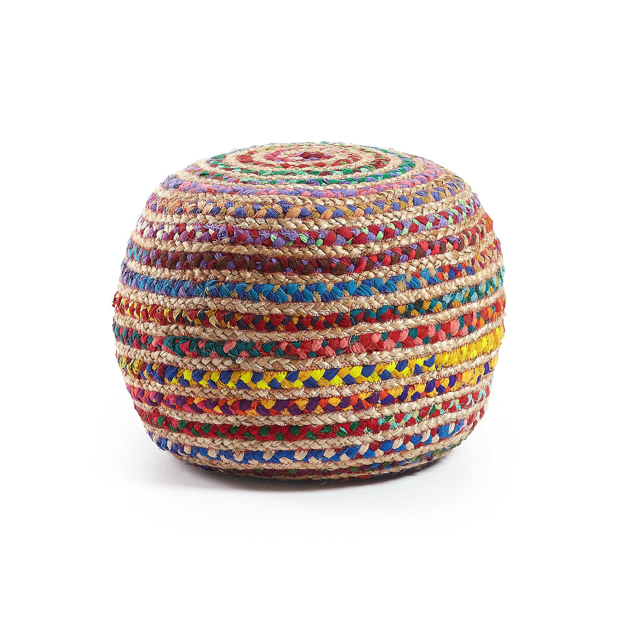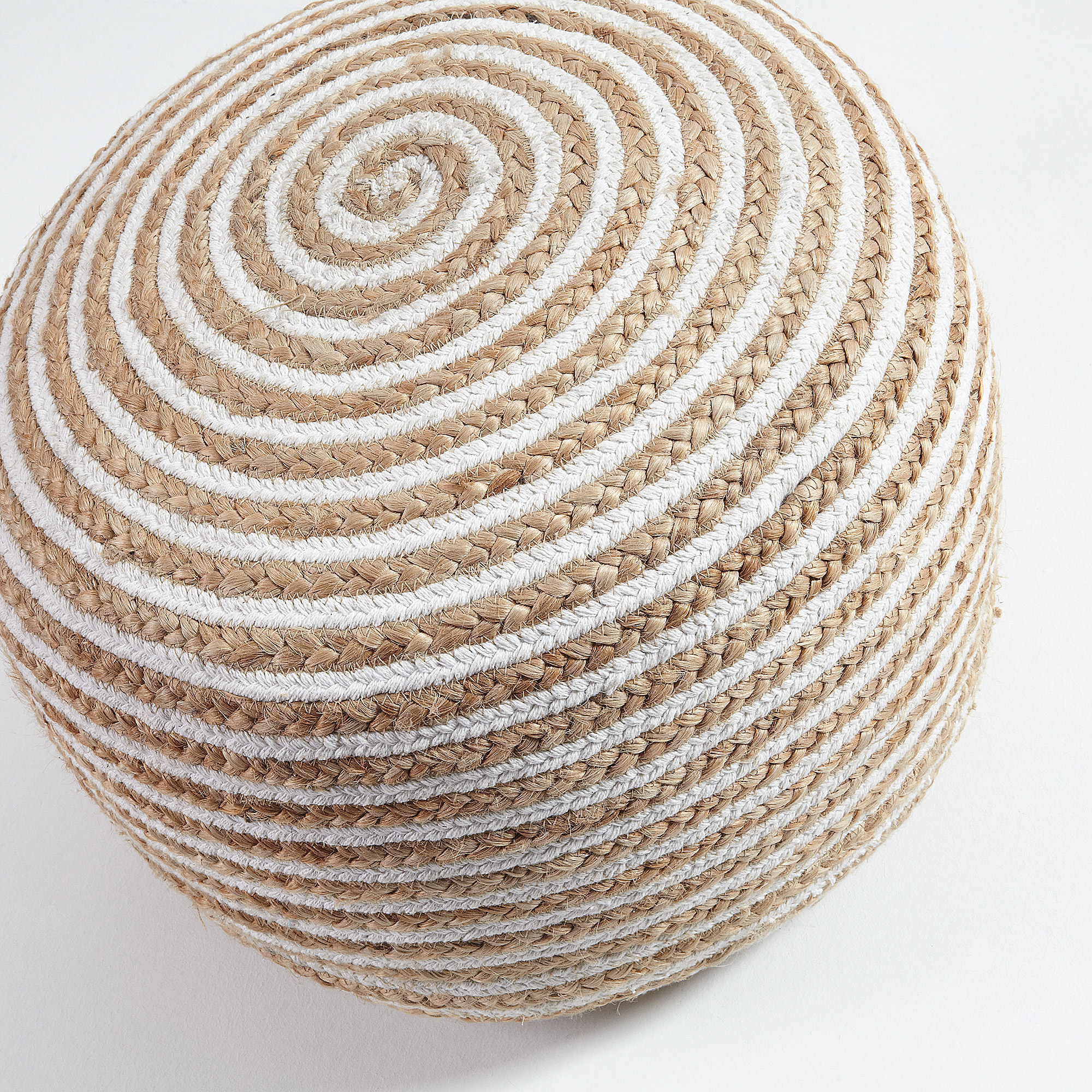 Runder Hocker aus natürlicher Jute kombiniert mit weißer Baumwolle. Nicht entfernbar. Polsterung enthalten.