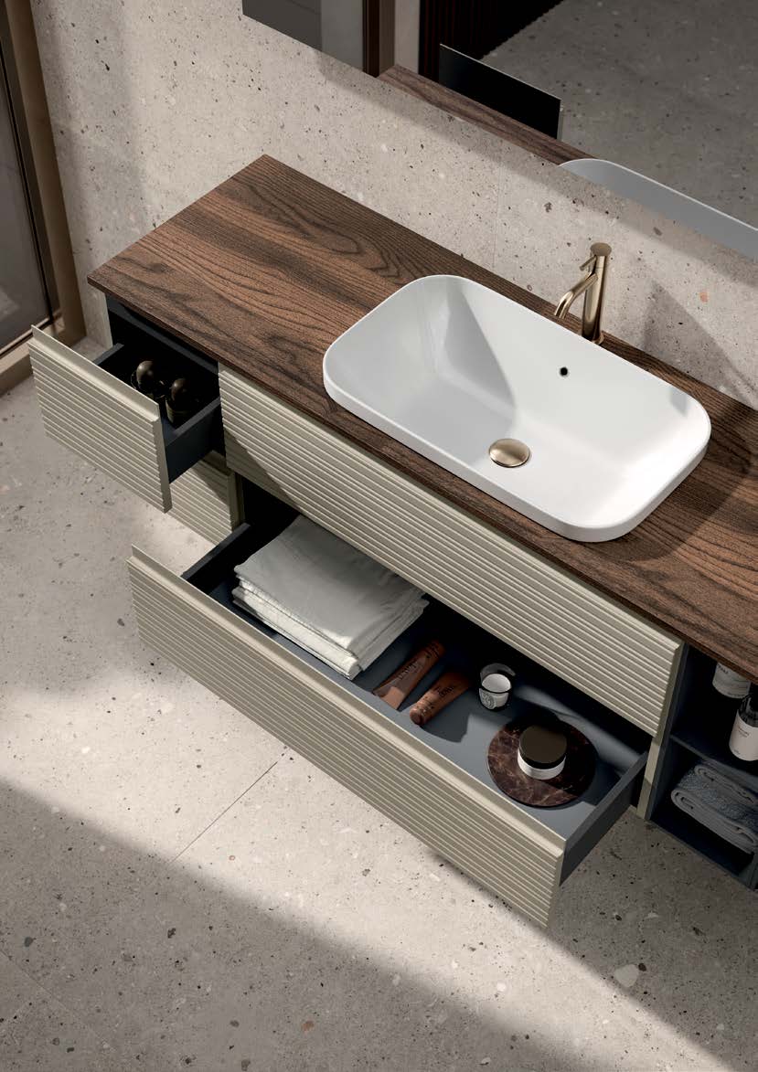 Saturno 114 ist in verschiedenen Ausführungen und Konfigurationen erhältlich, um die Badmöbel optimal an den Stil und die Bedürfnisse des Kunden anzupassen. Eine elegante und funktionale Wahl, um den Raum mit dem 100 % italienischen Design von Oltrebagno aufzuwerten.