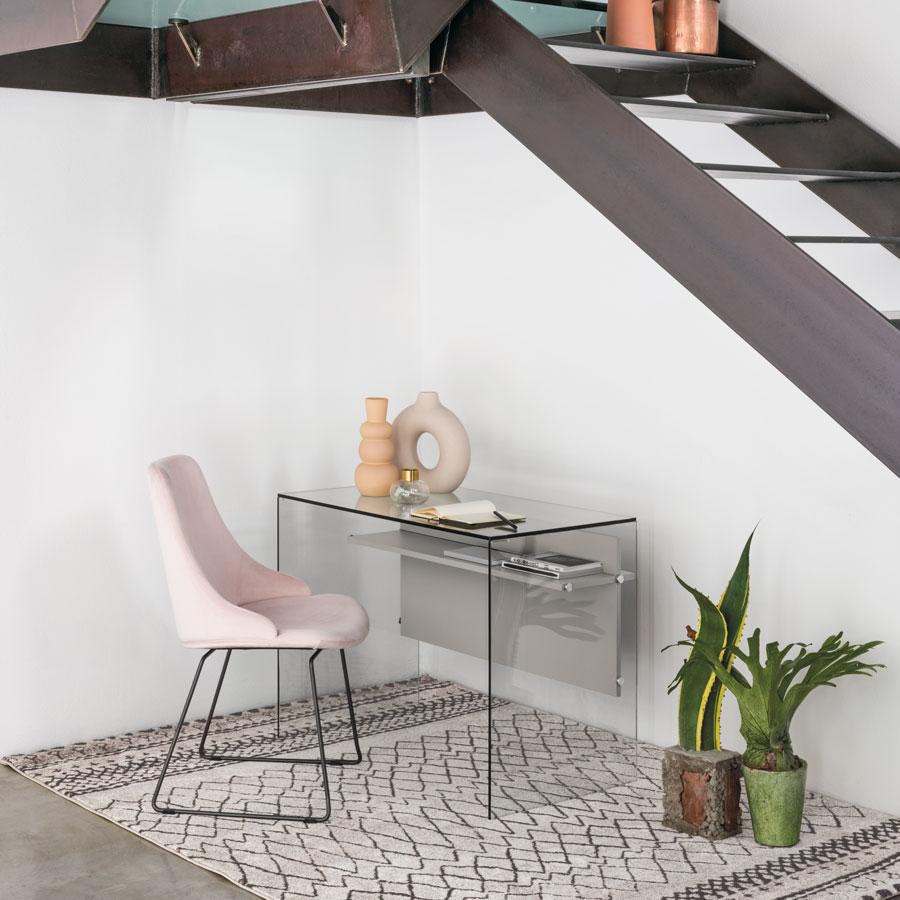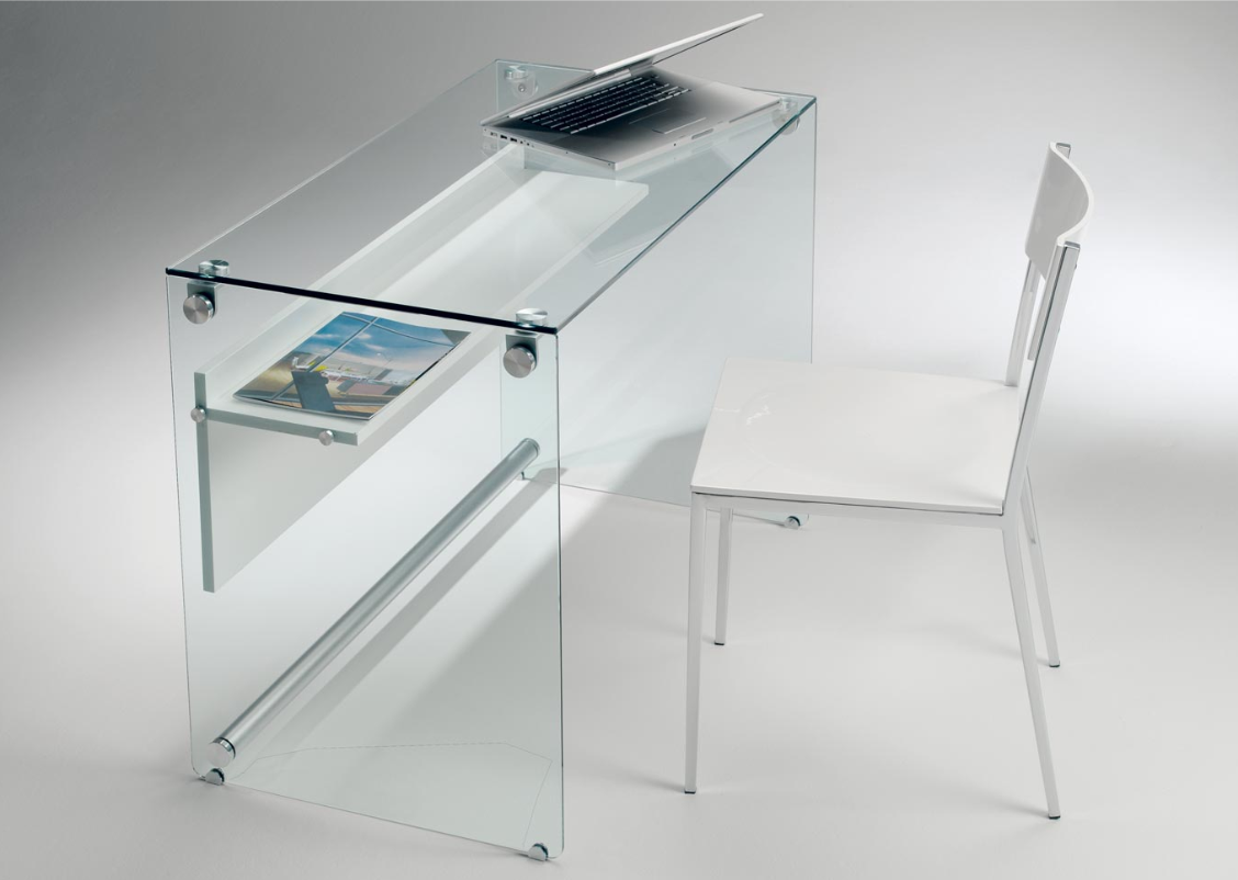Moderner Schreibtisch aus gehärtetem Glas, erhältlich in transparenter oder rauchfarbener Ausführung, mit einer unteren Holzablage.
