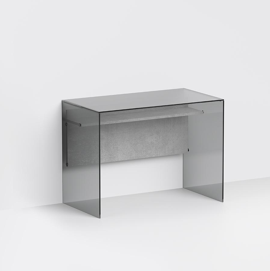 Eleganter und funktionaler Schreibtisch aus gehärtetem Glas, erhältlich in transparent oder rauchgrau.