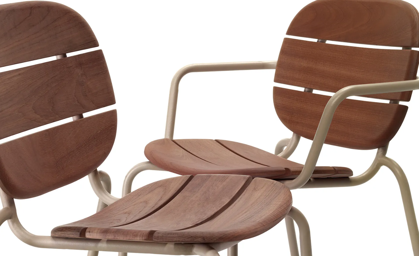 Sitzfläche und Rückenlehne bestehen aus massiven Sapelli-Mahagoni-Lamellen , die speziell für den Außenbereich behandelt wurden und so Witterungsbeständigkeit, Stabilität und lange Lebensdauer gewährleisten.