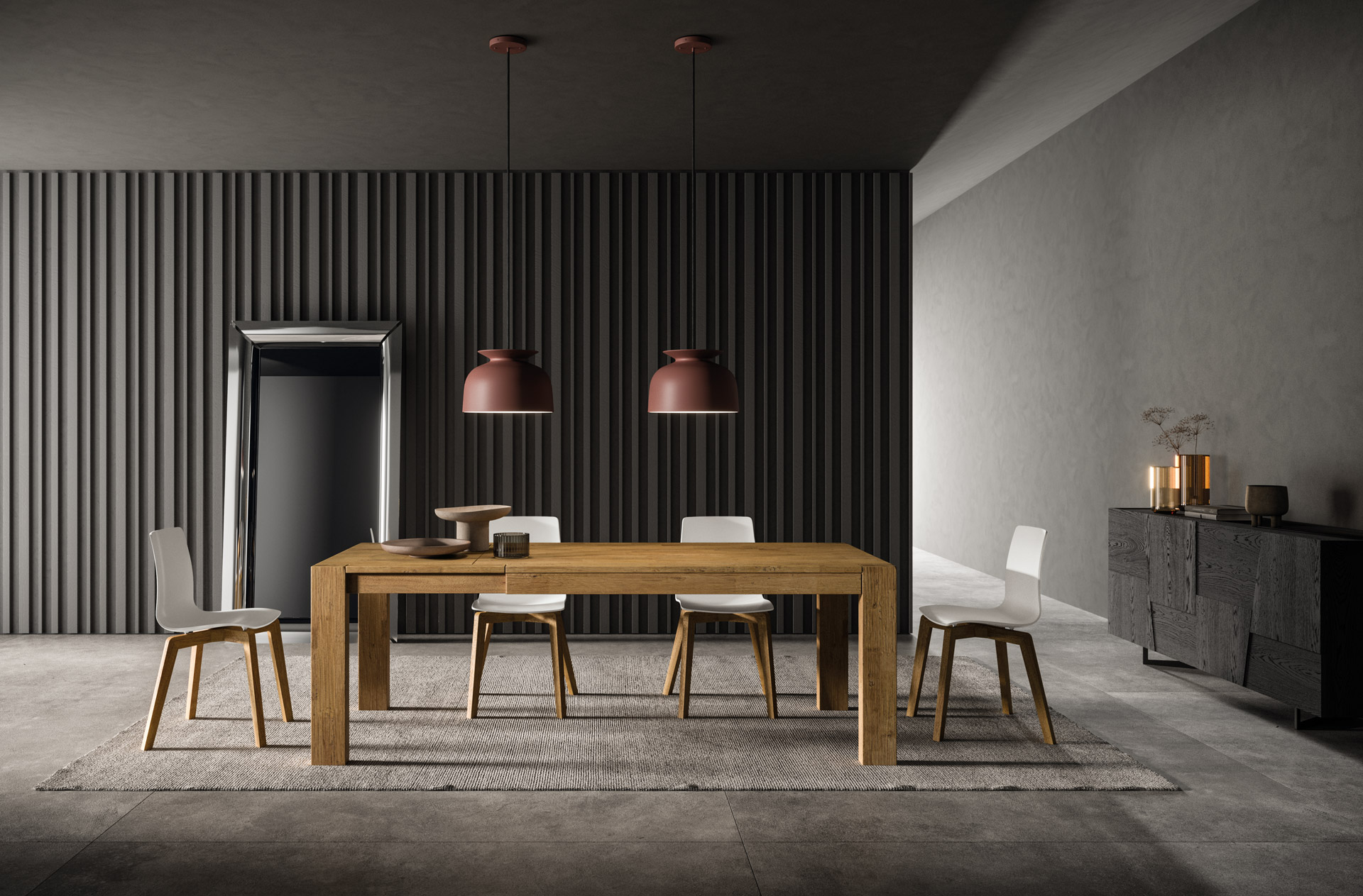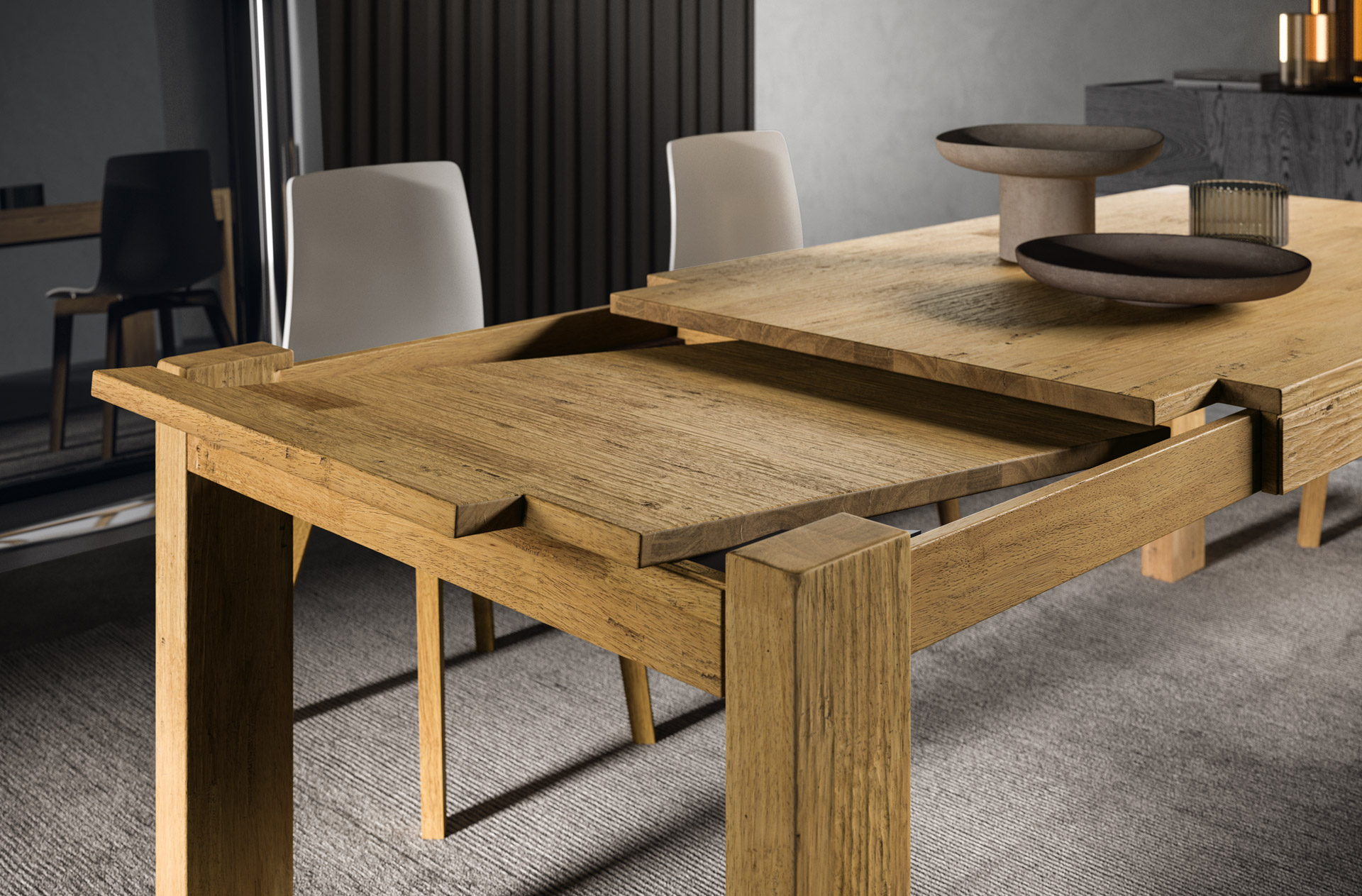 Eines der innovativsten Merkmale des MOOD-Tisches ist das integrierte Verlängerungssystem. Bei Bedarf können Sie den Tisch mit einer praktischen, im Inneren der Struktur versteckten Verlängerung verlängern, die den Abstand zwischen den Beinen vergrößert und zusätzlichen Platz bietet, um Freunde und Familie bequem unterzubringen. Funktionalität trifft auf Praktikabilität mit einer eleganten und diskreten Lösung.
