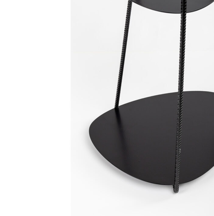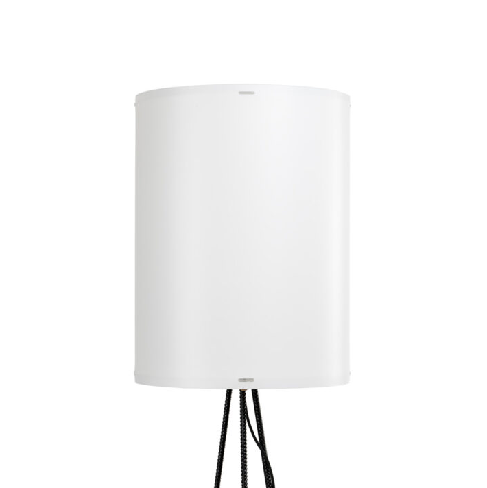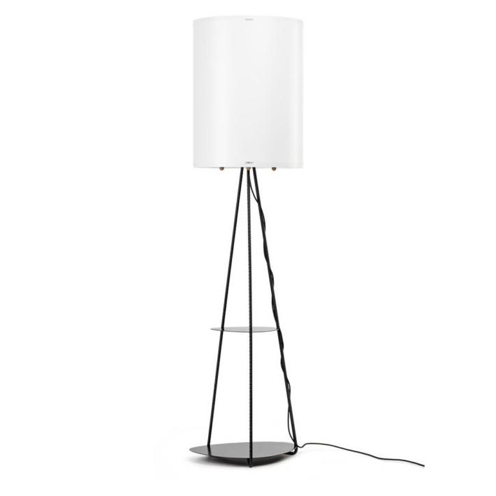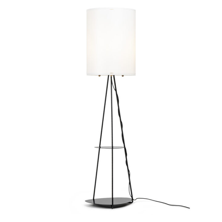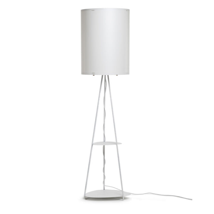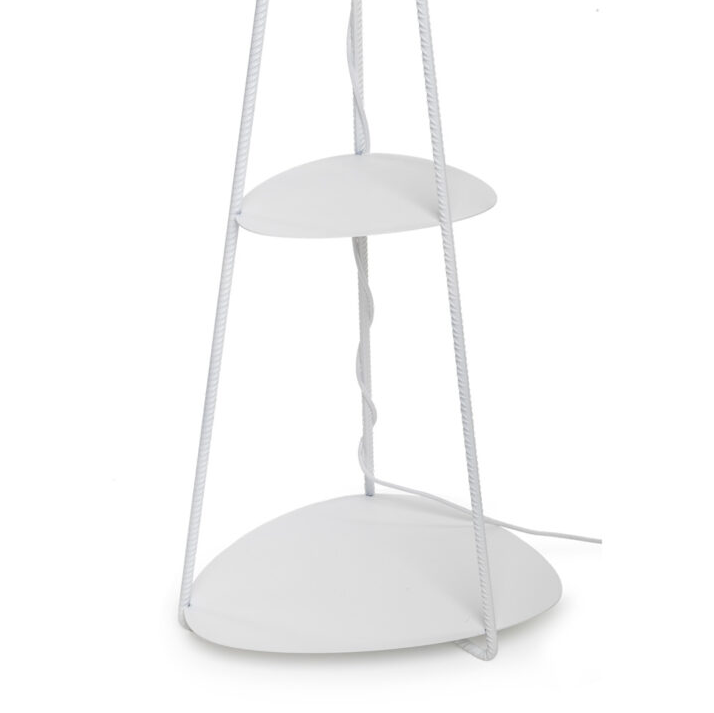 Der Lampenschirm besteht aus Polypropylen, während die Struktur aus lackiertem Eisen mit integrierten Ablagen besteht.