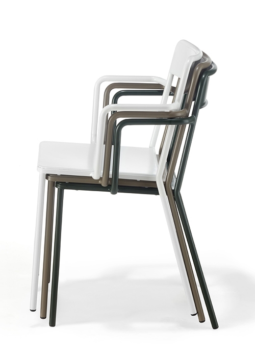 Wie beim Vorgängermodell machen die Materialauswahl und die Veredelungstechnologie, die aus einem Verzinkungsprozess des Metalls vor dem Pulverlackieren besteht, diesen Stuhl in allen Versionen zu einer hervorragenden Gelegenheit auch für extreme Einsatzsituationen im Freien Metall.