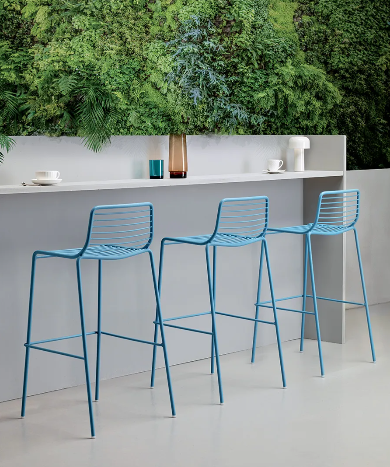 Die leichten, stapelbaren Sitze bieten Funktionalität ohne Abstriche beim Stil, während die Tische – in der 75 cm hohen Version – das Ensemble mit Ausgewogenheit und Funktionalität vervollständigen.