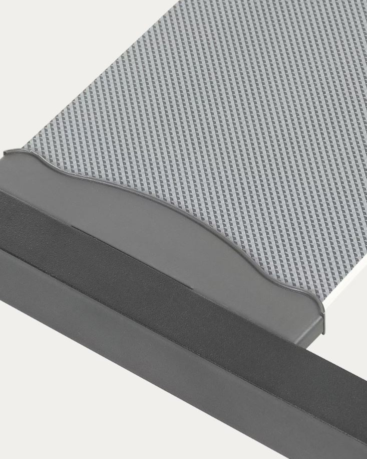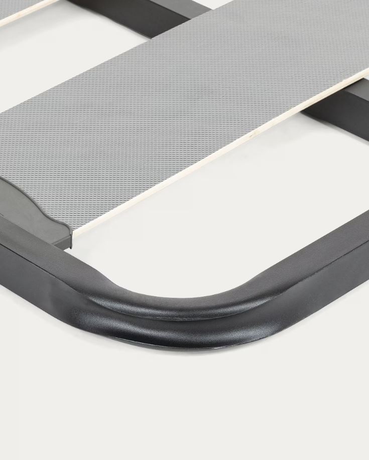 Bettgestell mit graphitfarbenem Metallrahmen und Holzlatten in Carbonfaseroptik. Schallabsorbierende Polyethylendichtungen. Inklusive Platten für X- oder S-Beine (nicht im Lieferumfang enthalten). Vierbeinig verwendbar.