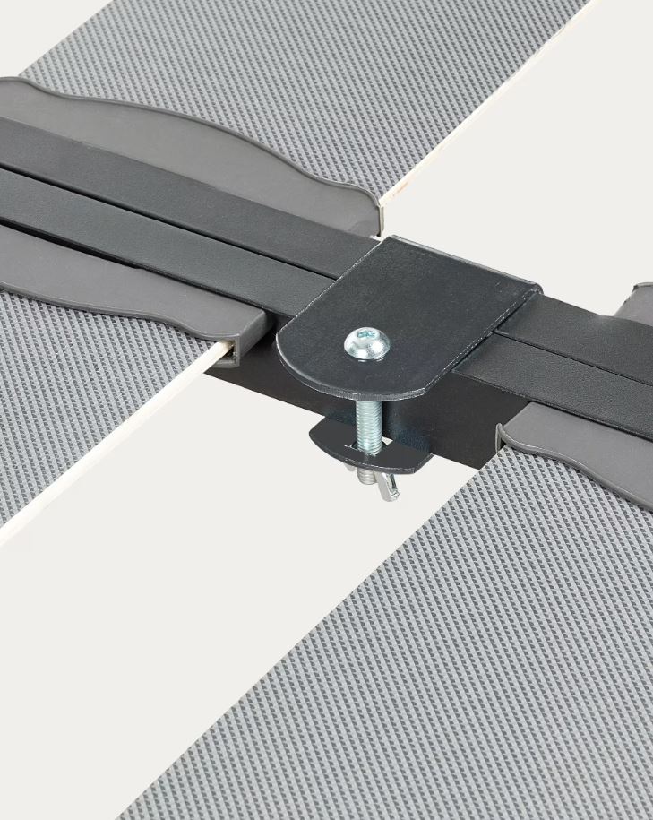 Bettgestell mit graphitfarbenem Metallrahmen und Holzlatten in Carbonfaseroptik. Schallabsorbierende Polyethylendichtungen. Inklusive Platten für X- oder S-Beine (nicht im Lieferumfang enthalten). Vierbeinig verwendbar.