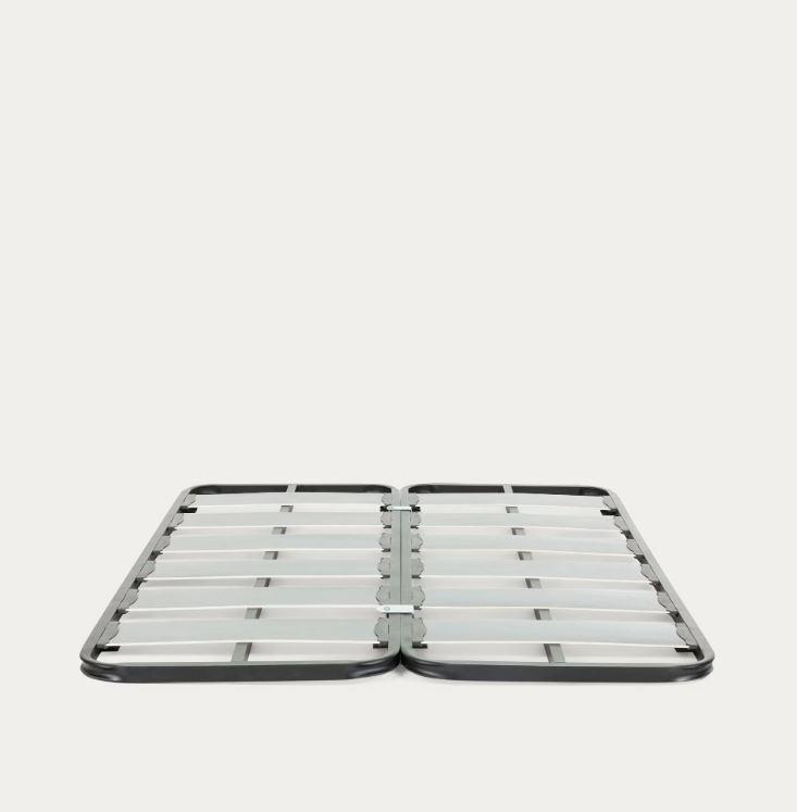 Bettgestell mit graphitfarbenem Metallrahmen und Holzlatten mit Carbonfaser-Effekt.