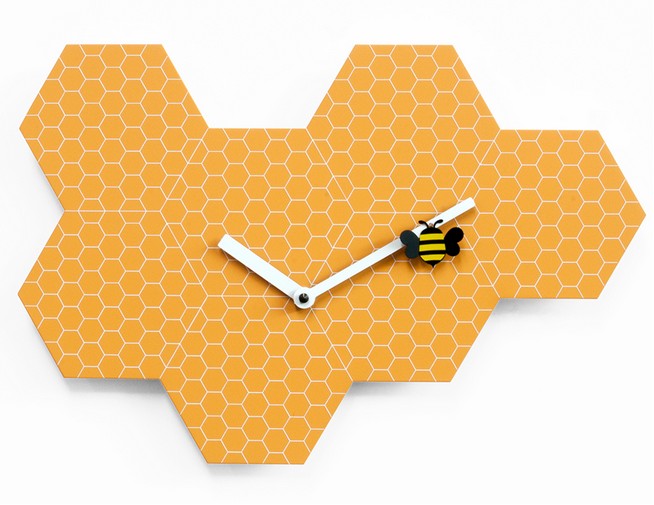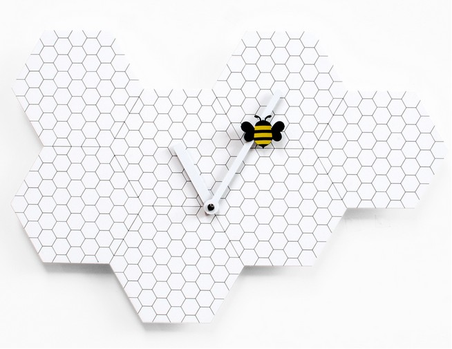 Lustige und farbenfrohe Partyuhr, ideal für die Räume der Jüngsten oder um den Räumen einen Hauch von Freude und Unbeschwertheit zu verleihen. Es besteht aus Time2bee-Stahl und nimmt die Form und Grafik der Bienenstöcke an, in denen sich eine gelbe und schwarze Biene, die am Minutenzeiger hängt, leise zwischen den Zellen bewegt. Batterie Quarzwerk.