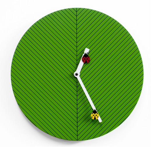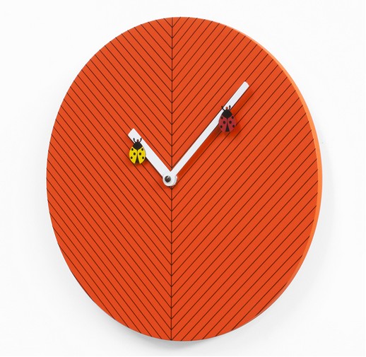 Rund, diskret, farbenfroh und lustig, das ist Time2bugs, die Wanduhr, die den Räumen der Kleinen Freude macht. Auf dem Zifferblatt befindet sich eine Grafik mit dünnen schwarzen Linien, die an die Adern eines Blattes erinnern, auf dem zwei sich bewegende Marienkäfer liegen, einer gelb und der andere rot. Die Struktur besteht aus Holz. Batterie Quarzwerk.