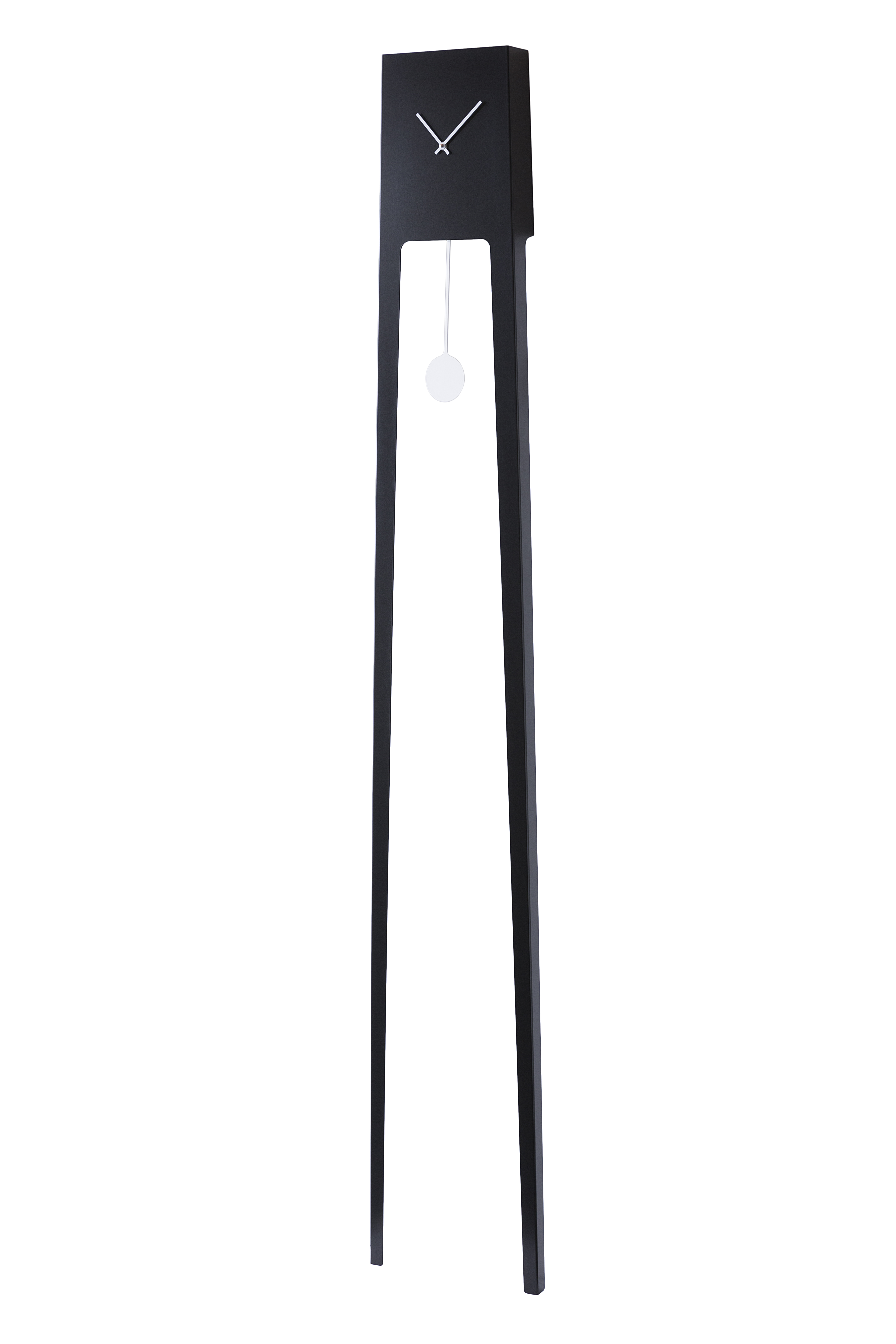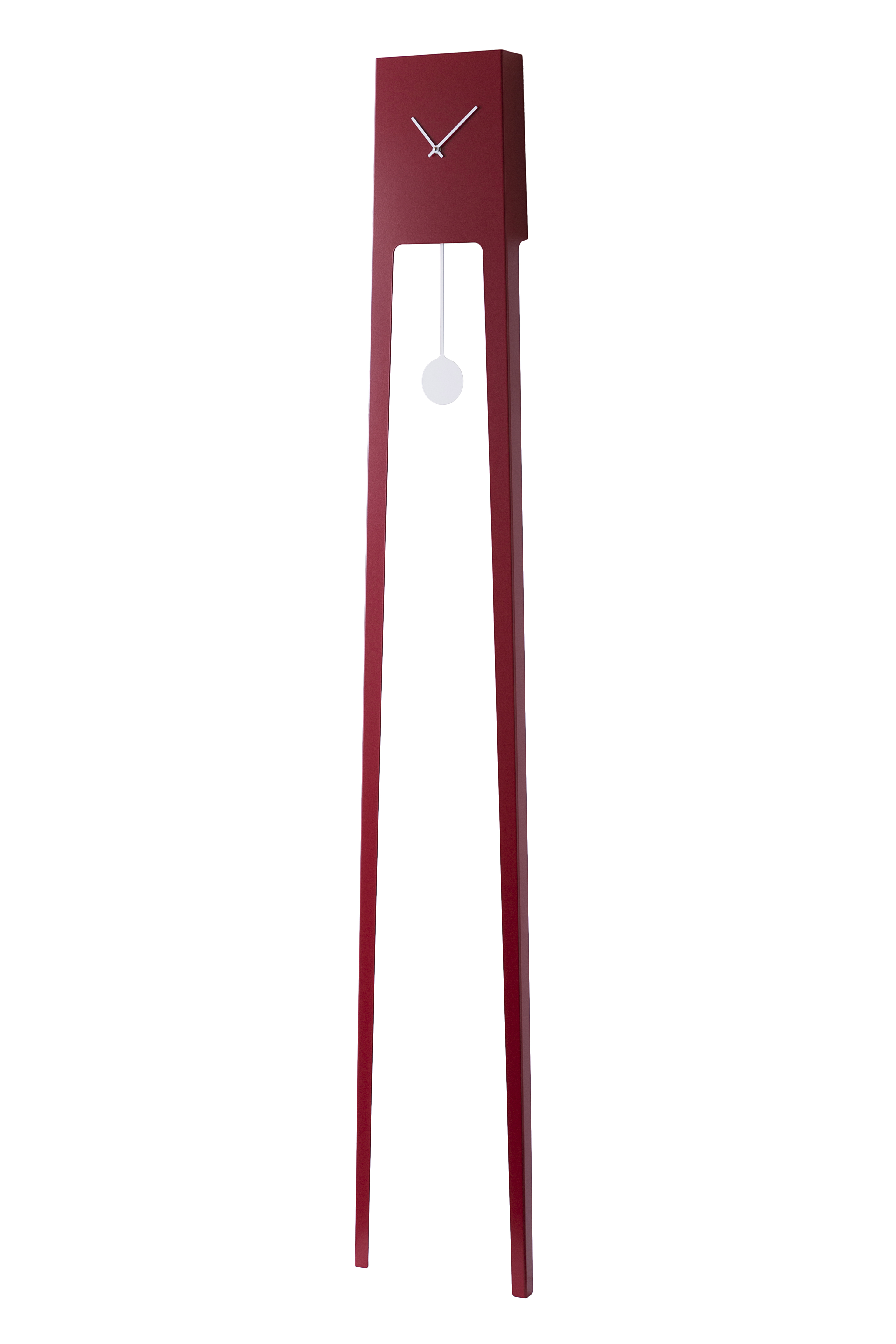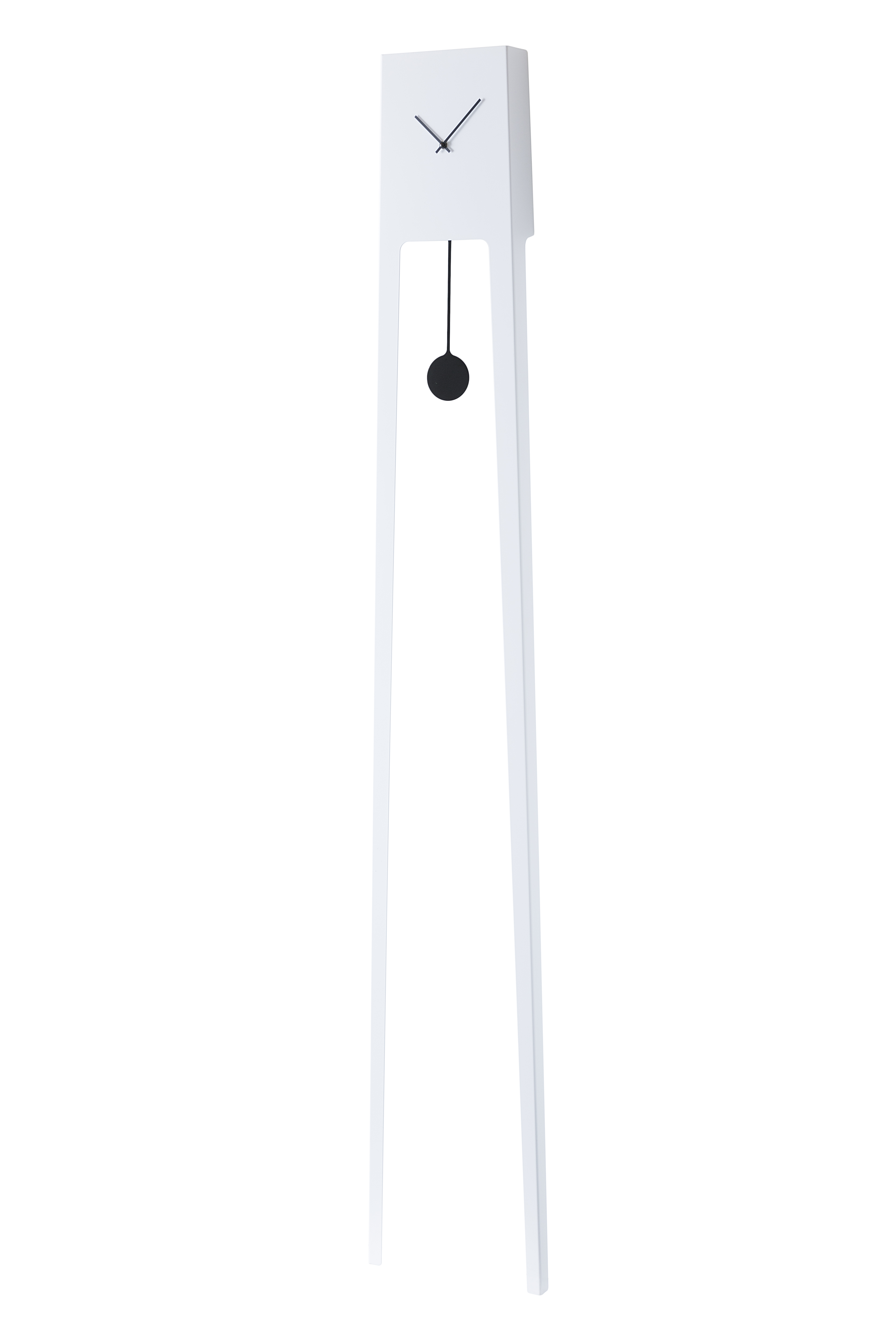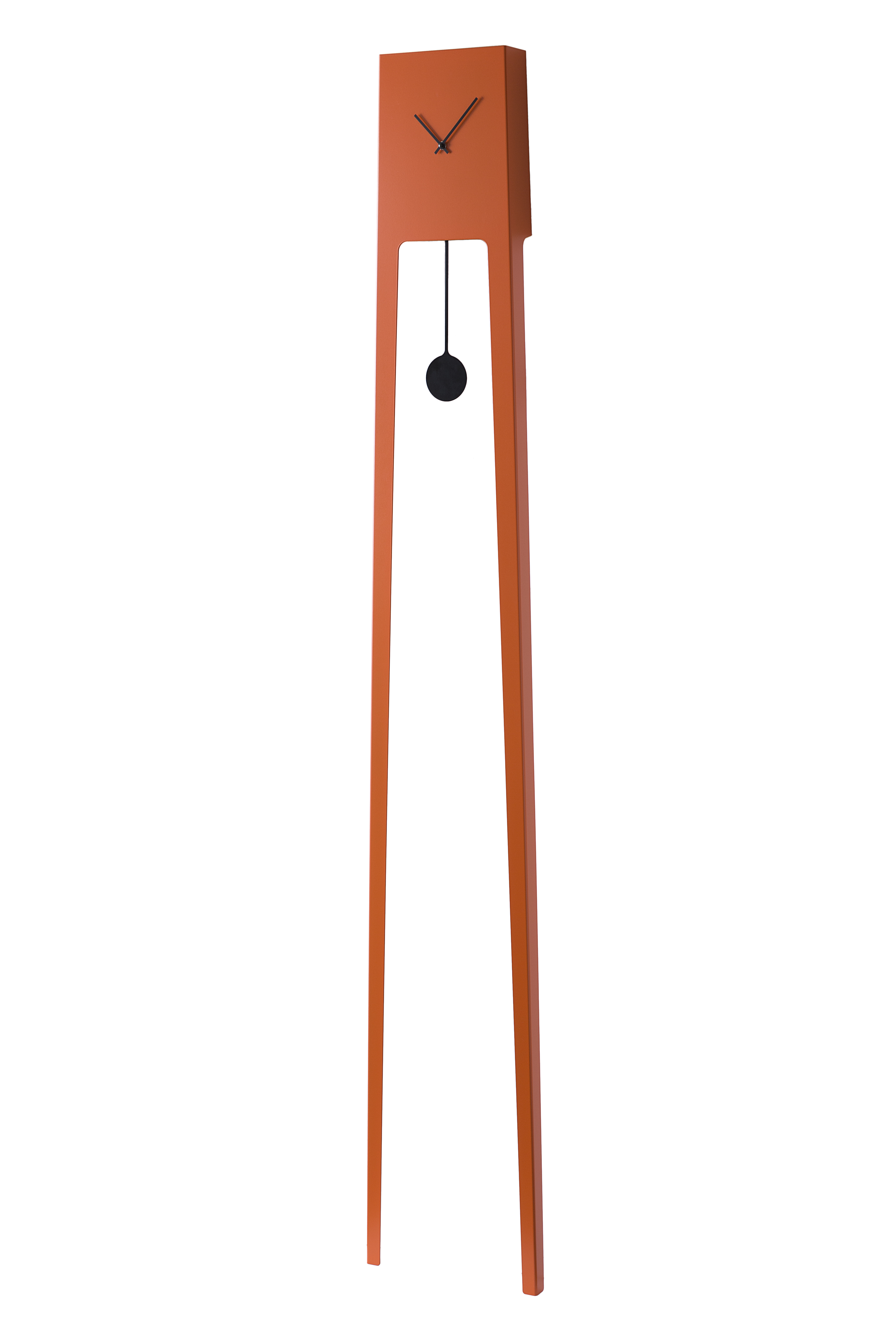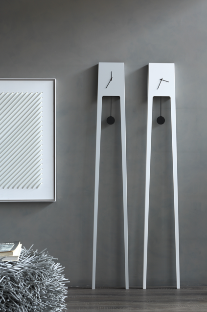 Tiuku besteht aus pulverbeschichtetem Stahl , ist in verschiedenen Farbausführungen erhältlich und kann dank seiner freistehenden Struktur an der Wand angebracht werden. Das Quarzwerk garantiert Präzision, während die längliche Form und die grafische Silhouette ihn perfekt machen, um hohe Wände, Eingänge, Wohnzimmer und Büros mit einem modernen Touch zu verschönern.